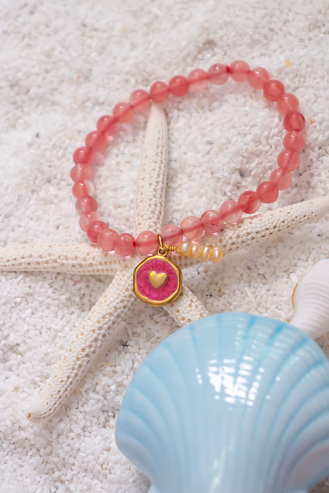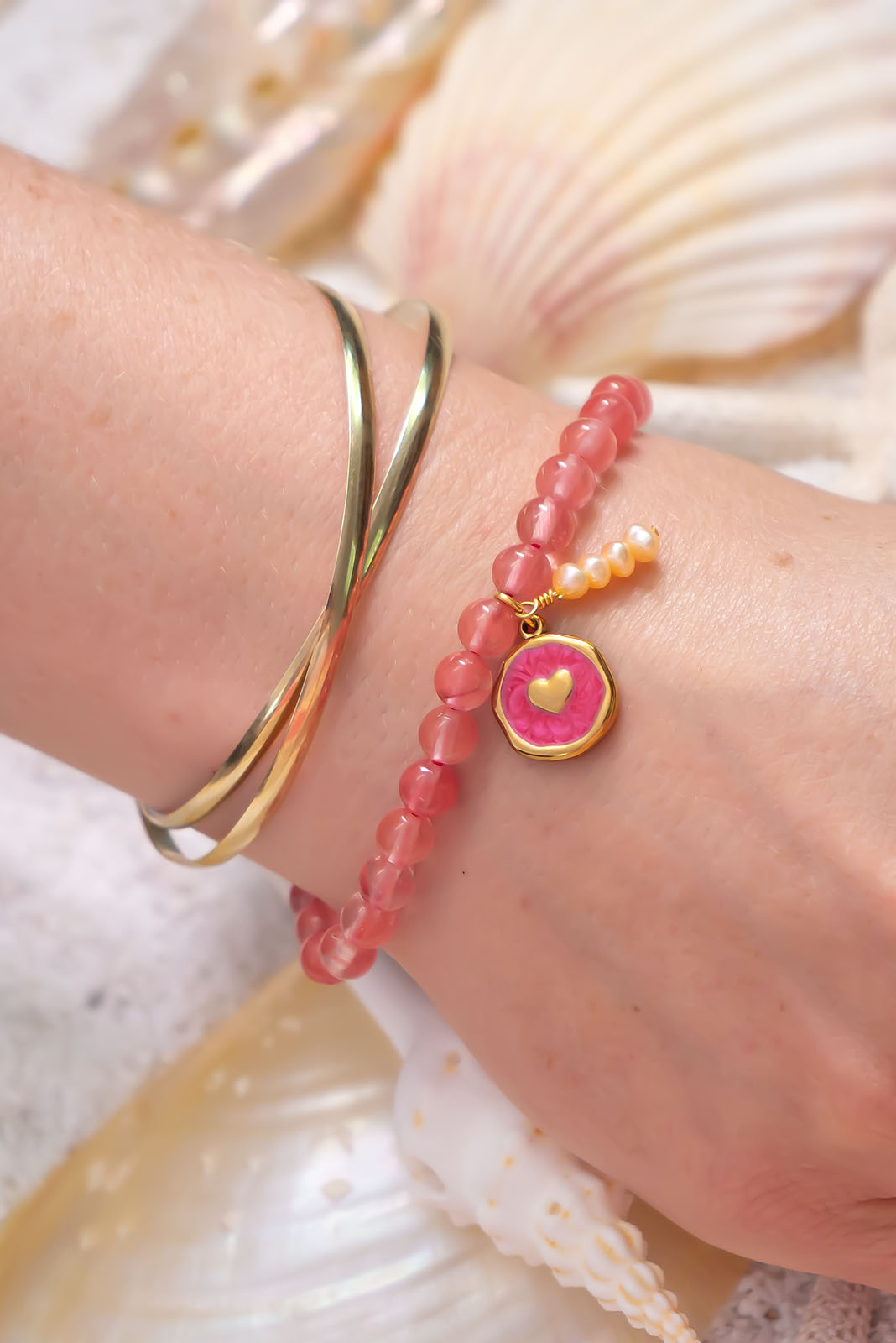 - Strawberry quartz bracelet with a gold plated enamelled heart medallion and a soft peachy pink pearl charm.
