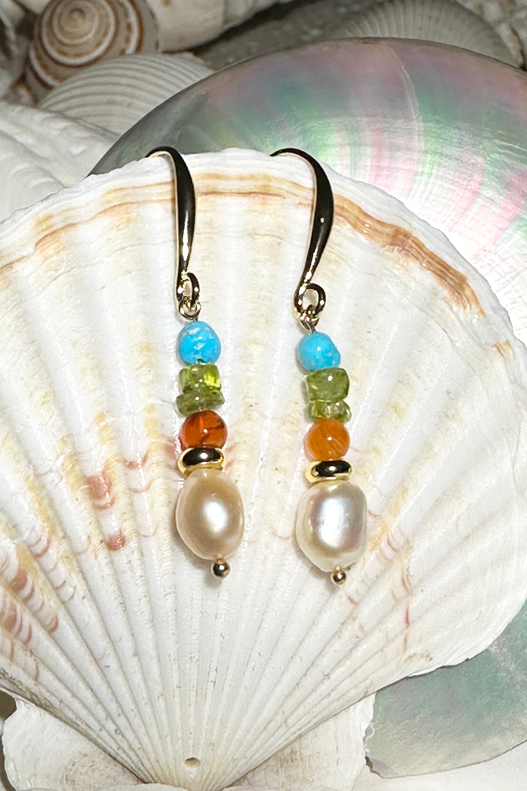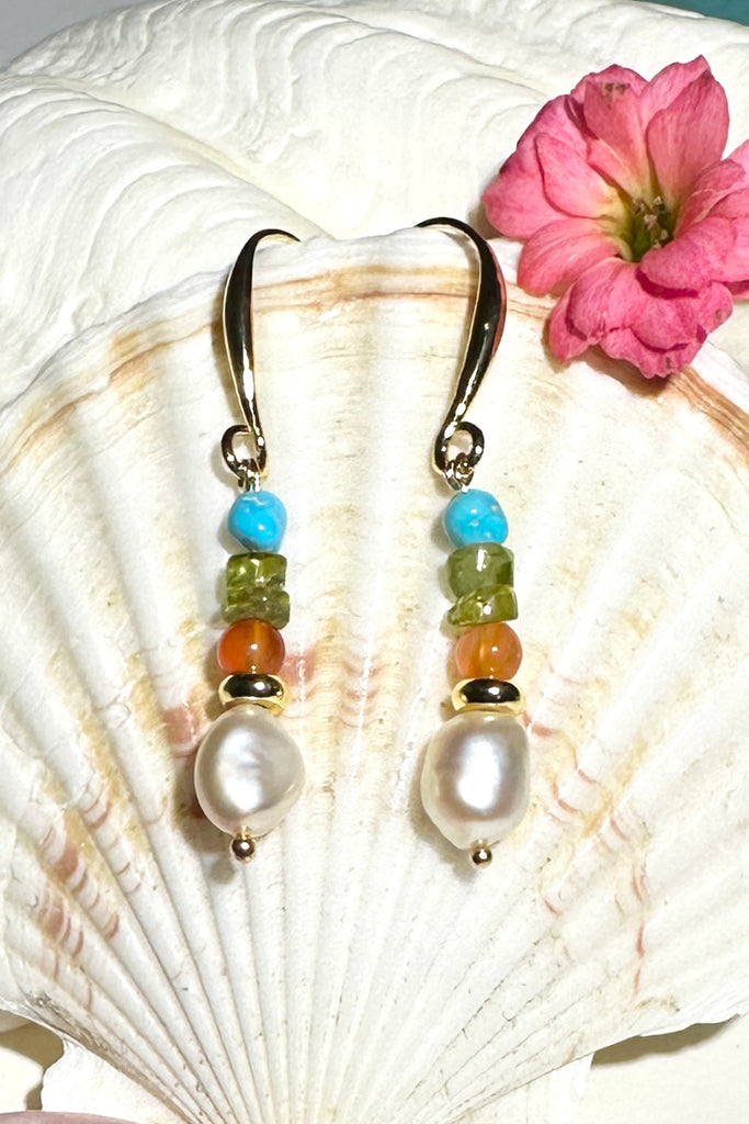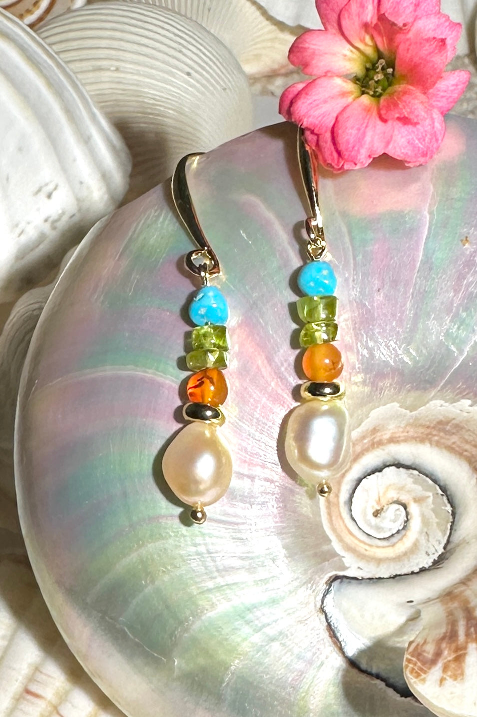 - Gemstones are natural Kingman Turquoise, freshwater pearls, Peridot, and Carnelian.