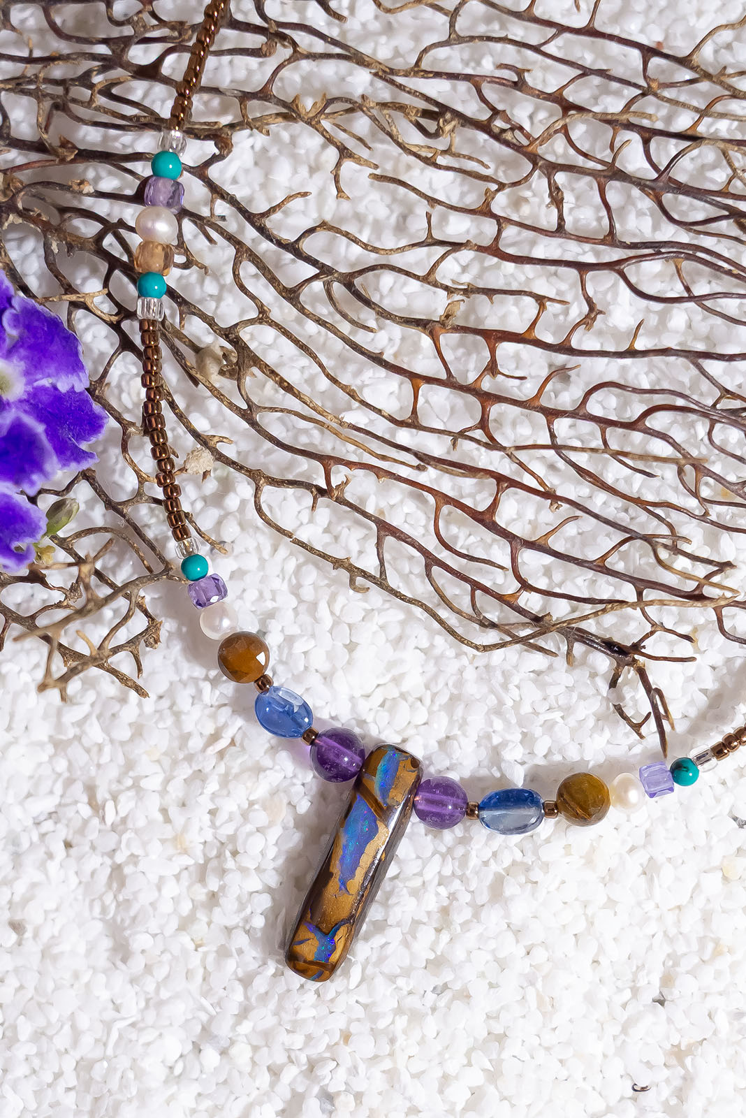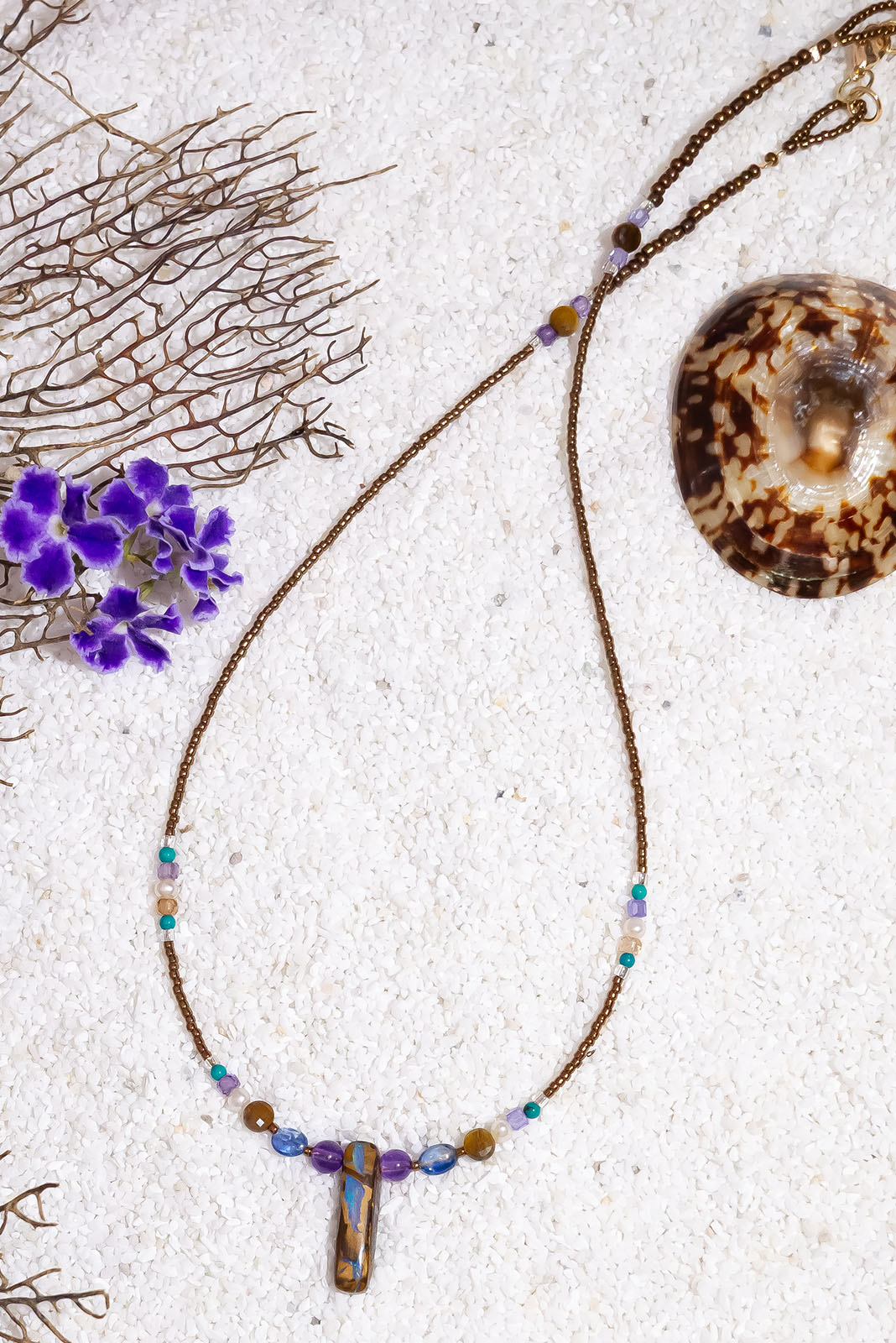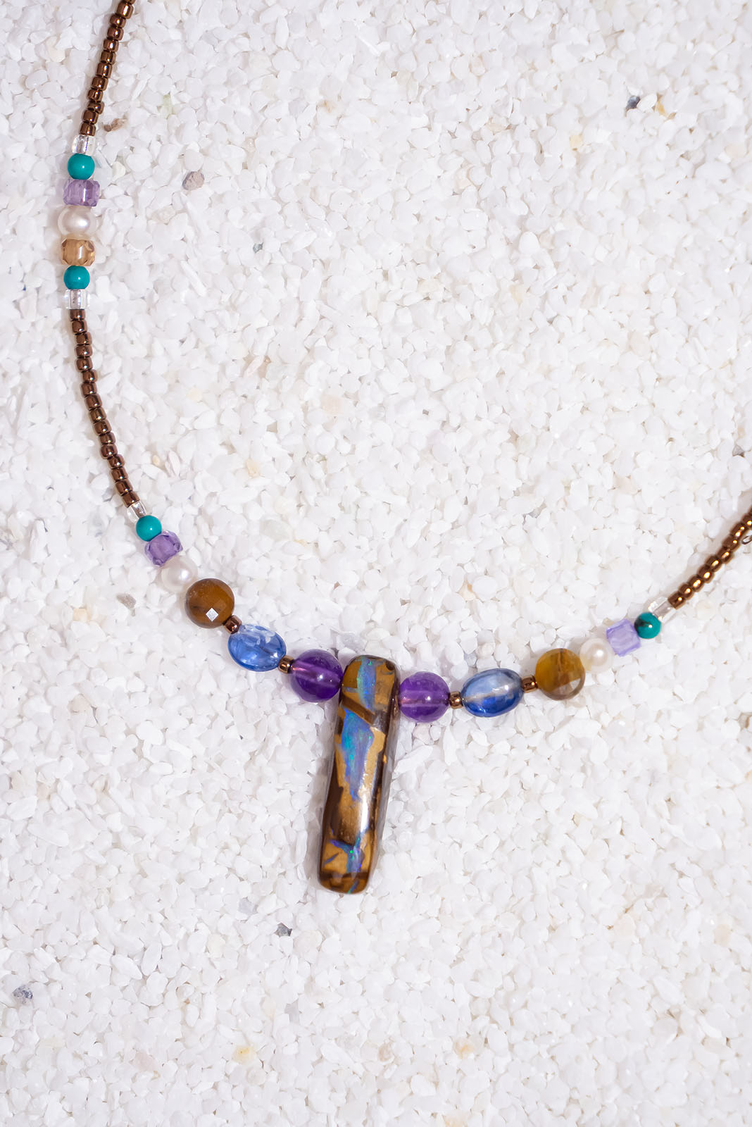 - Solid Boulder Opal pendant strung on bronze colour seed beads beads with blue Kyanite, Amethyst, Pearl, Tigers Eye and Turquoise.