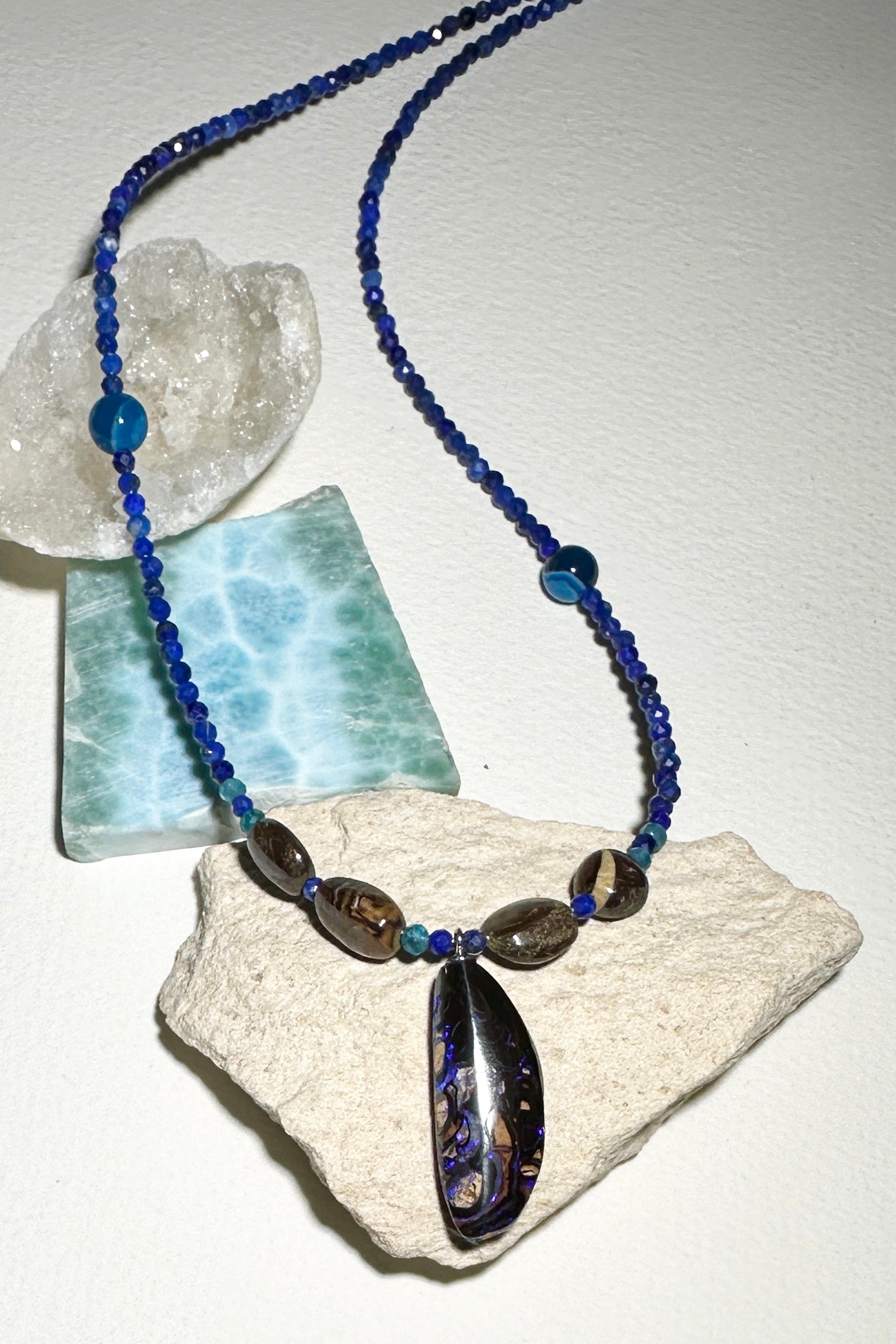 - Solid Boulder Opal pendant strung on Lapis Lazuli. Opal is ethically sourced.