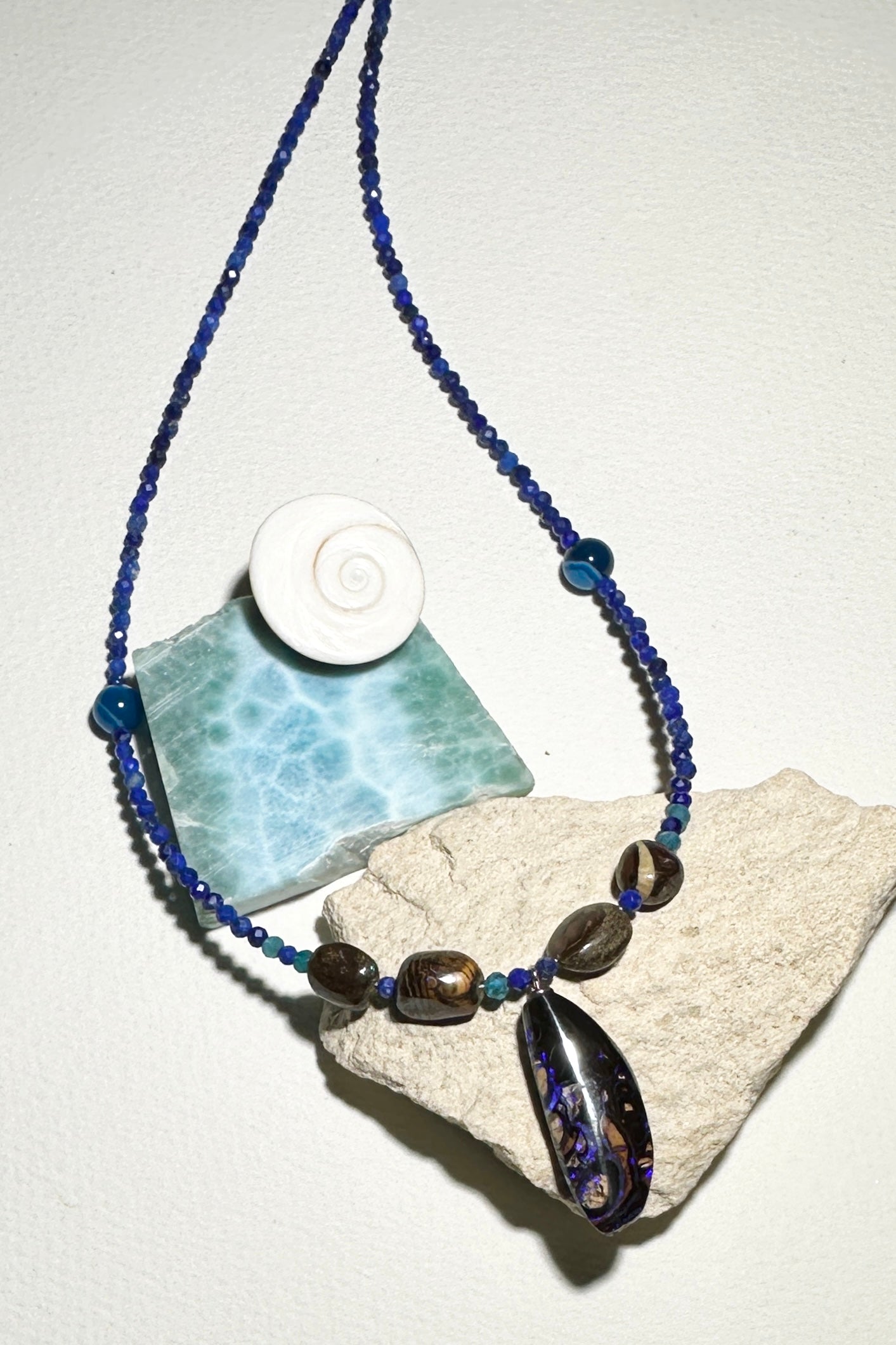 A solid Australian Opal necklace, the beads are the deepest blue Lapis Lazuli, the Opal has lovely rust and chocolate markings with some blue crystal. A chic and beautiful Opal necklace handmade in Noosa.