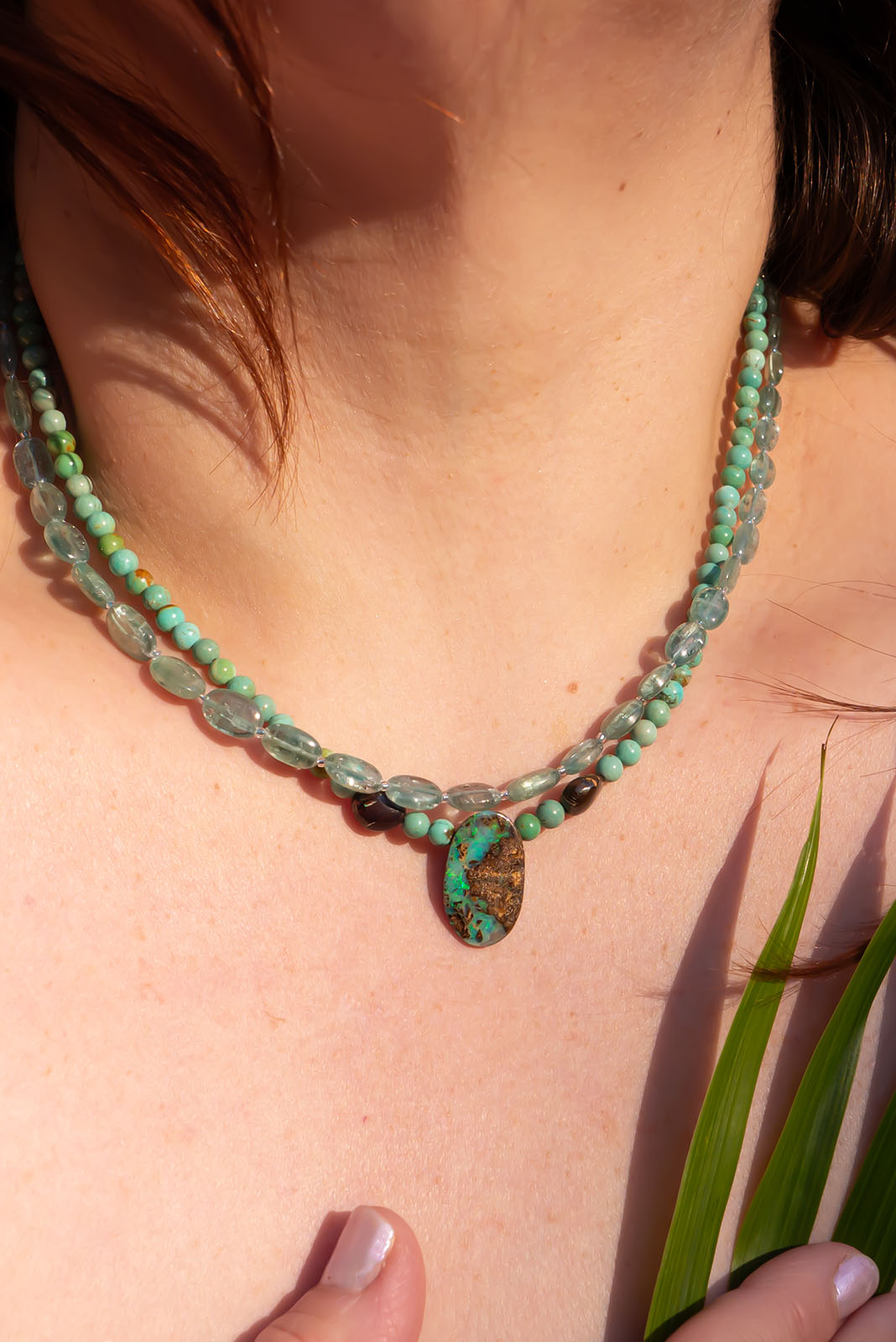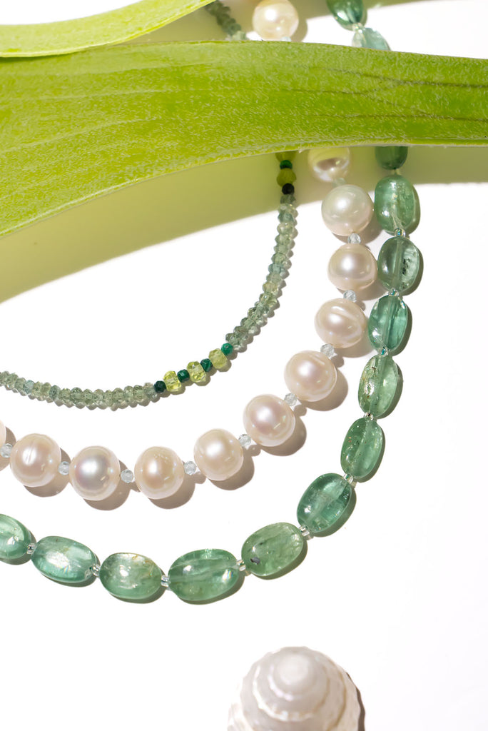 Highly polished soft green Kyanite beads create a romantic swirl ocean of colour in this pretty necklace.