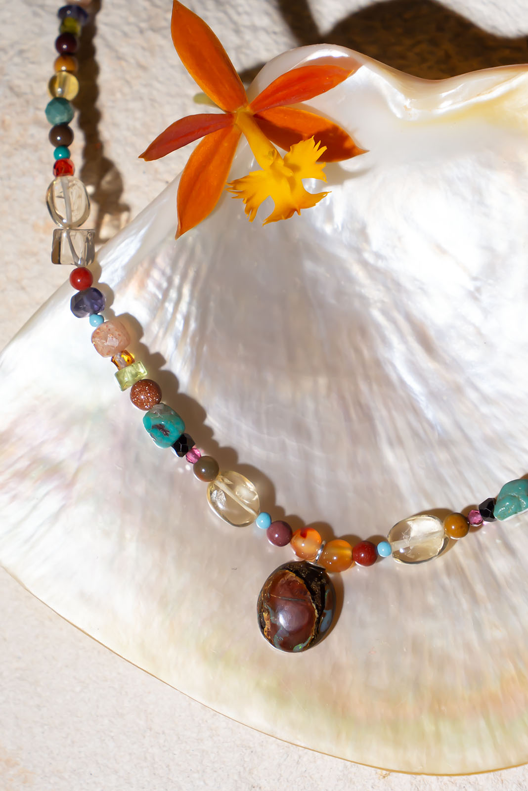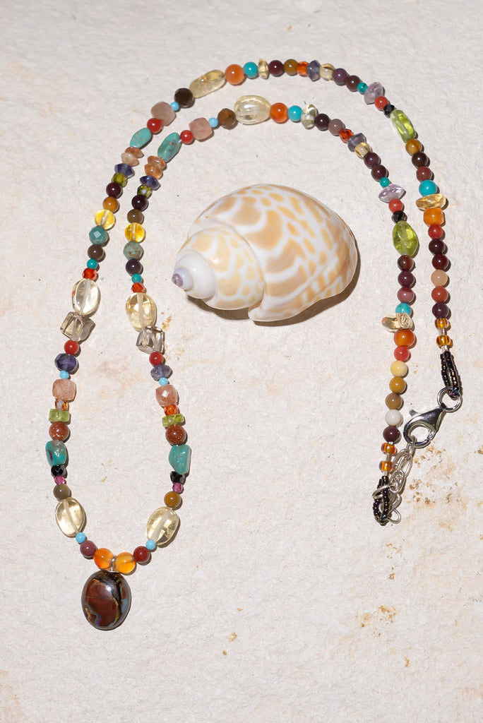 A kaleidoscope of glittering gems surround a Australian Opal in this enchanting multi stone bead gemstone necklace.