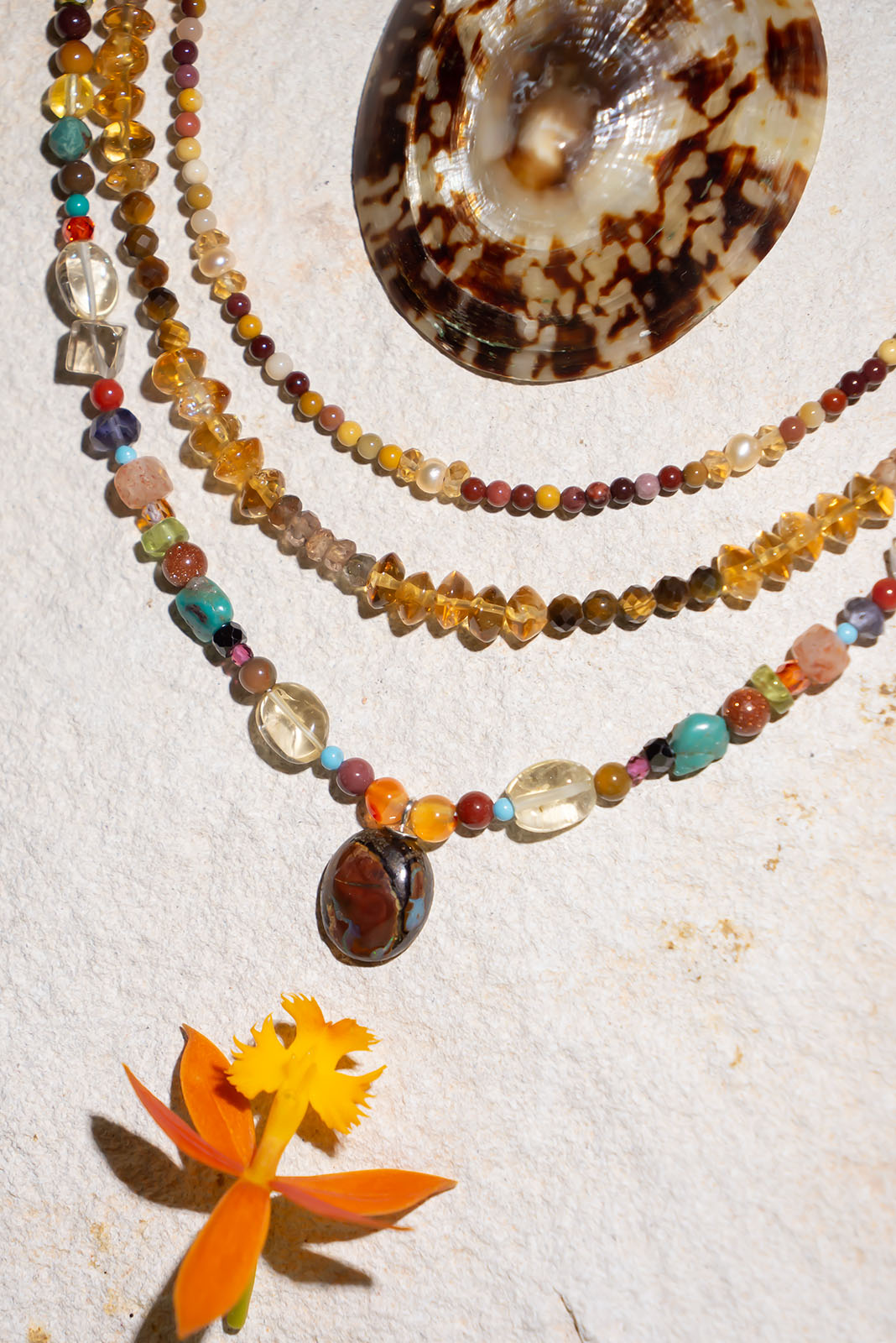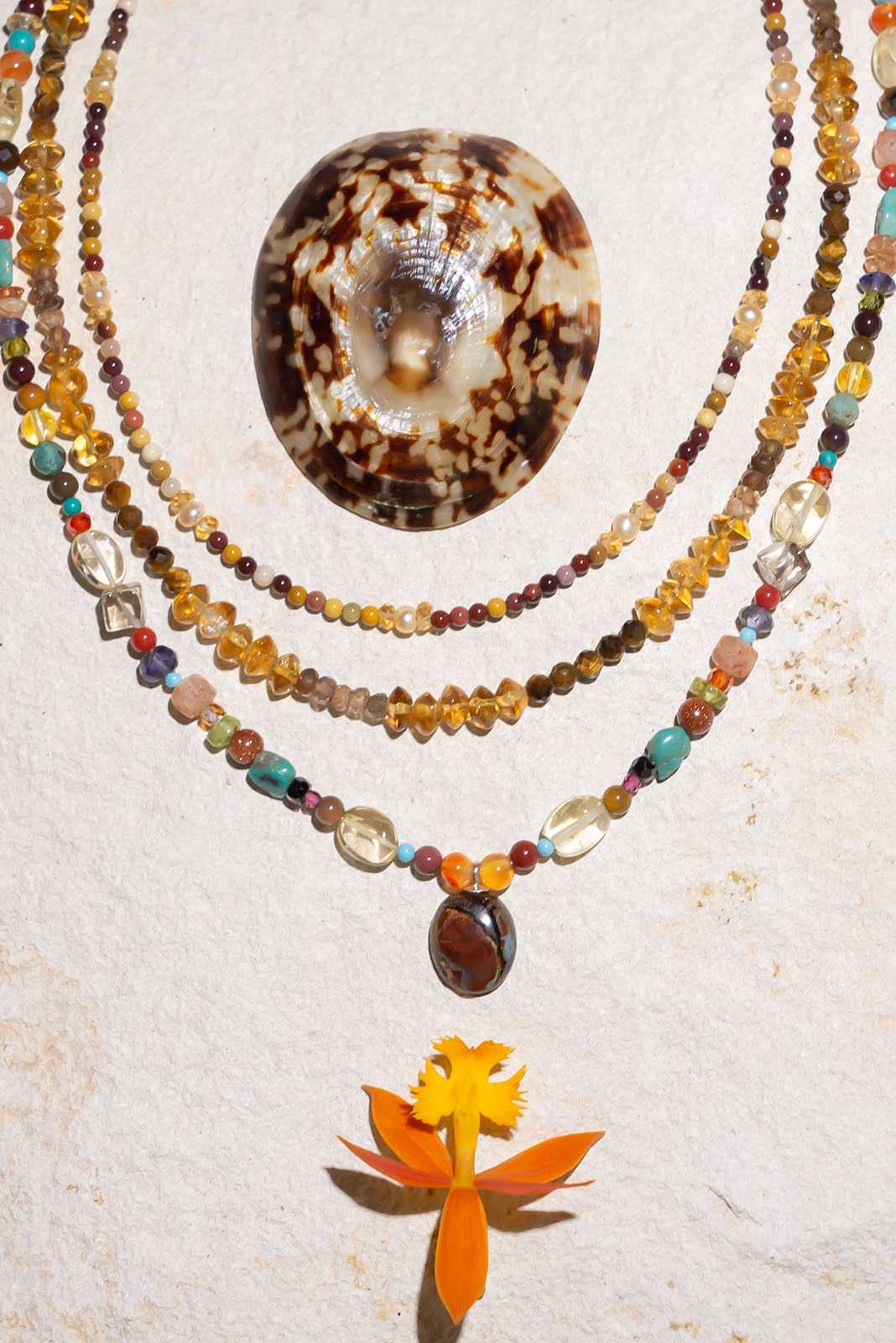 - The necklace is made from many gemstone seed beads, including natural Turquoise, carnelian, Peridot, Citrine, Amethyst and more.