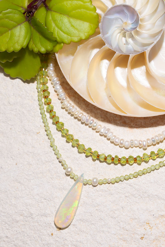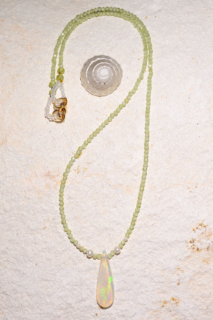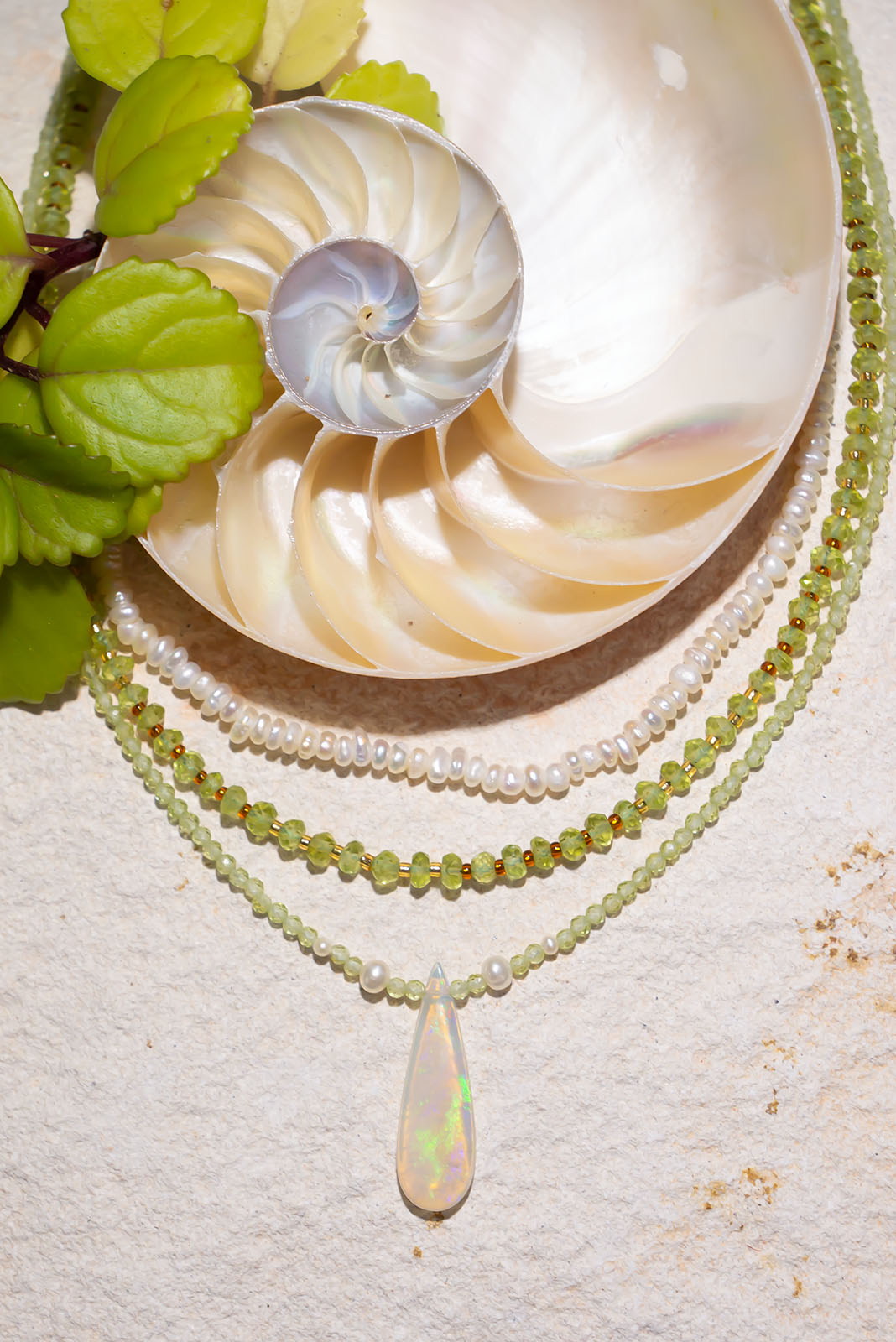 Peridot, Pearls and Opal, this divine whisp of a necklace has a delicate slip of crystal Opal as the centrepiece. Green, blue and mauve flashes across the opal in a magical dance of colour. So mystical and chic.