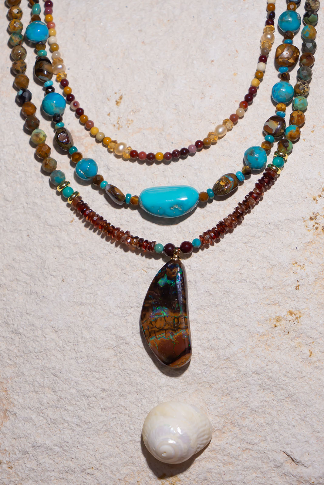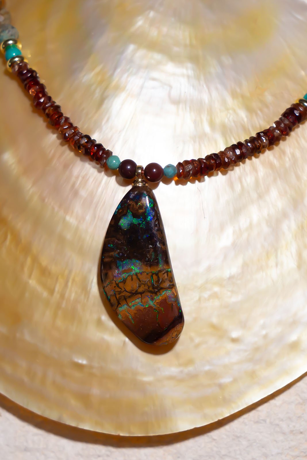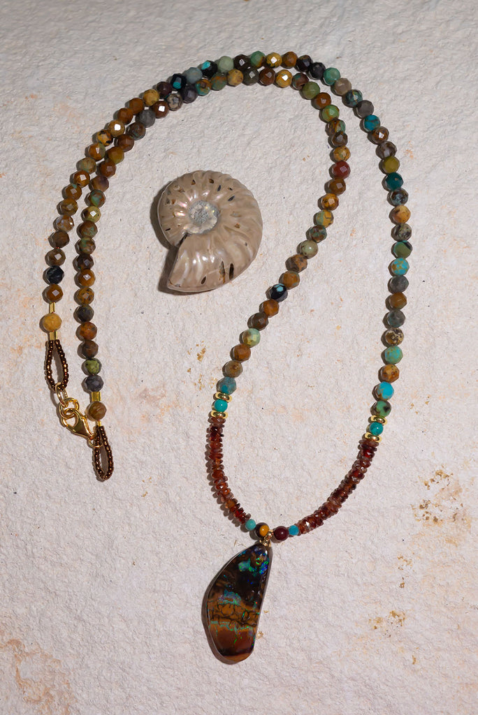 Inspired by the colours of the great Australian Outback this radiant piece features both an Australian Opal, Australian zircons & natural turquoise.