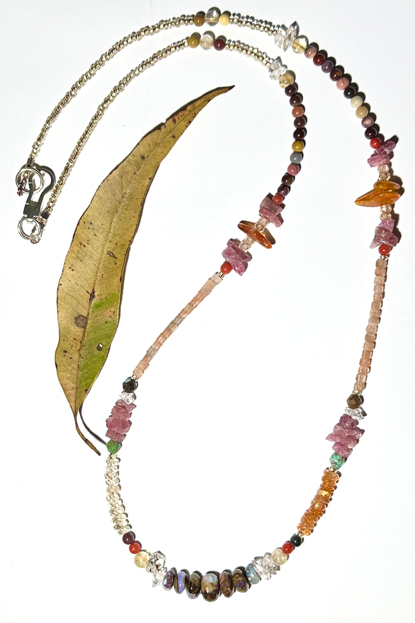 The colours of the Australian outback in gemstones. Inspired by a visit to Winton, I designed this sparkling and mystical necklace.