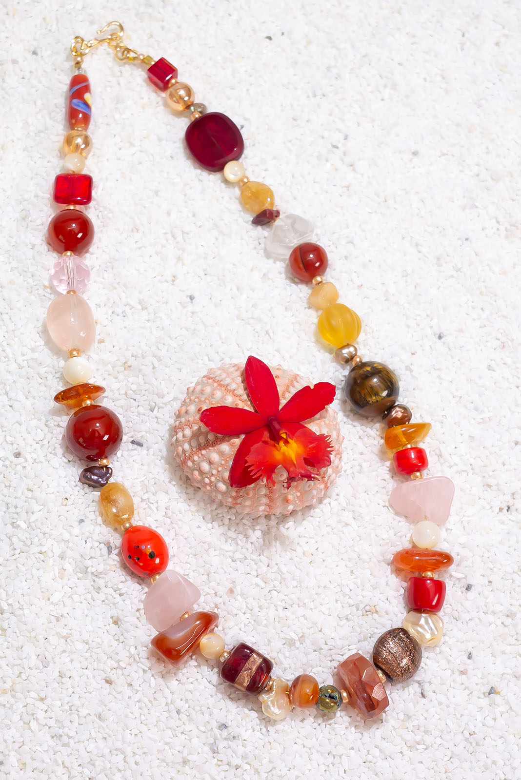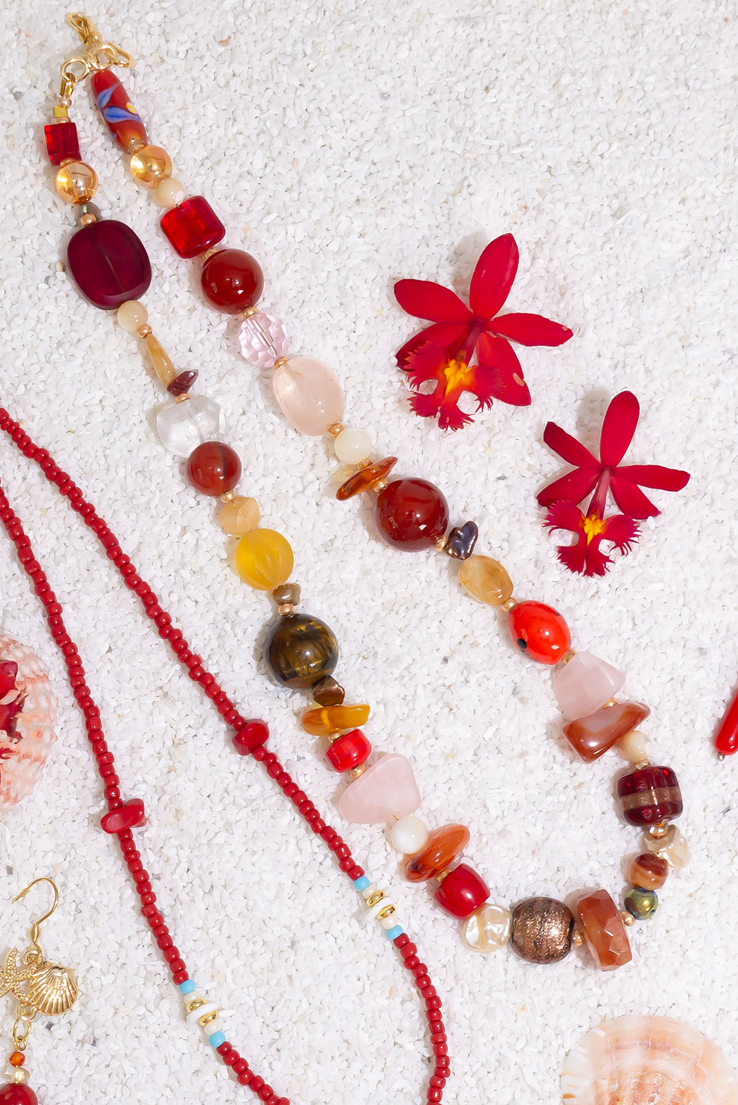 - Beads can include Tigers Eye, Carnelian, Quartz, Amber, baroque pearls, Mother of Pearl, bamboo coral, vintage glass beads, glass lampwork beads and African glass beads.