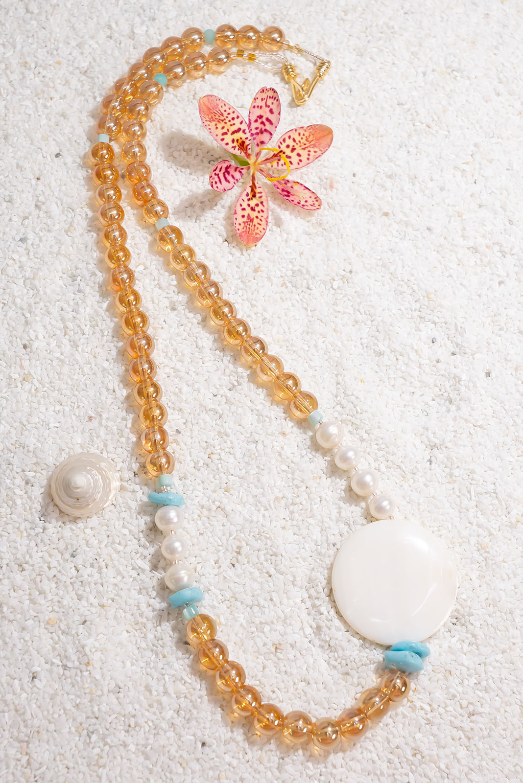 Floating bubbles of golden crystal, luminescent pearls and Mother of Pearl an ocean inspired necklace for a mermaid.