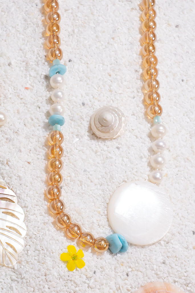 - Mother of Pearl shell disc, 8mm white rondelle pearls, blue Peruvian Opal and gold electroplated rock crystal beads.