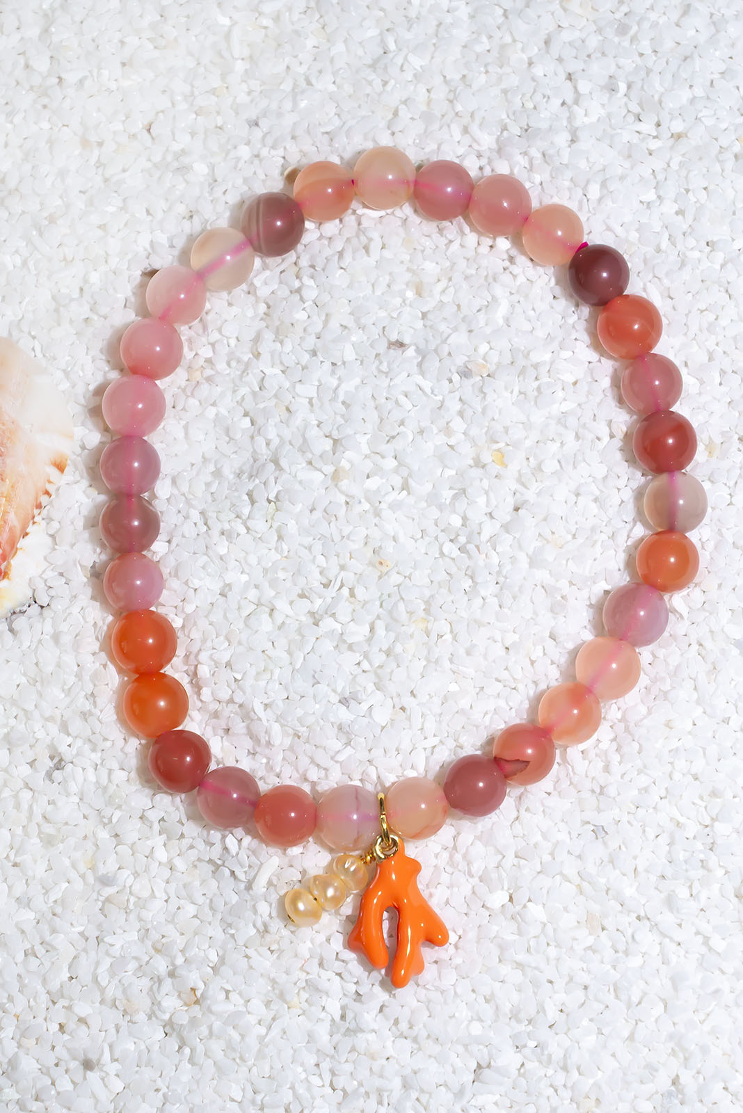 - Pink agate bracelet with a peach pearls & enamelled coral charm