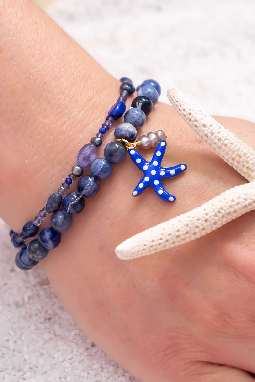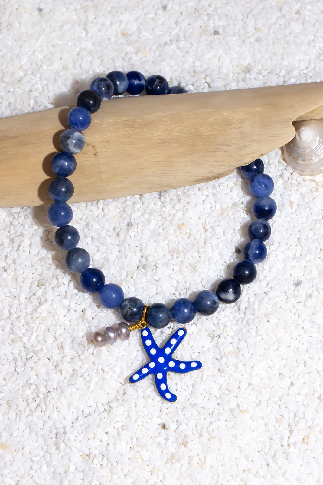 • Sodalite bracelet with a enamelled starfish charm & 3 soft grey pearls.