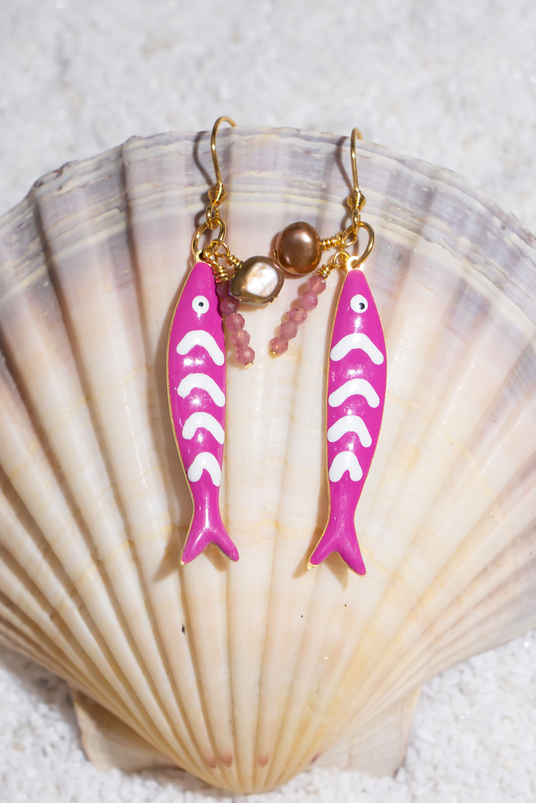 Summer earrings from the sea in our new ocean inspired Belle charm range, happy pink enamelled fish with pearls and gemstones. Beach style earrings.