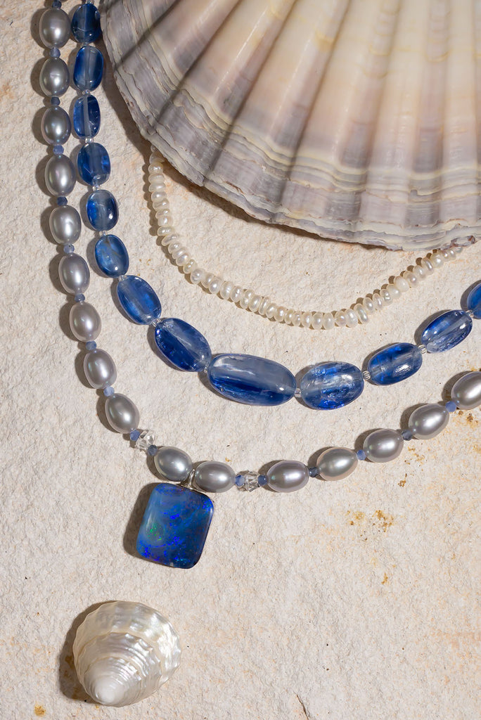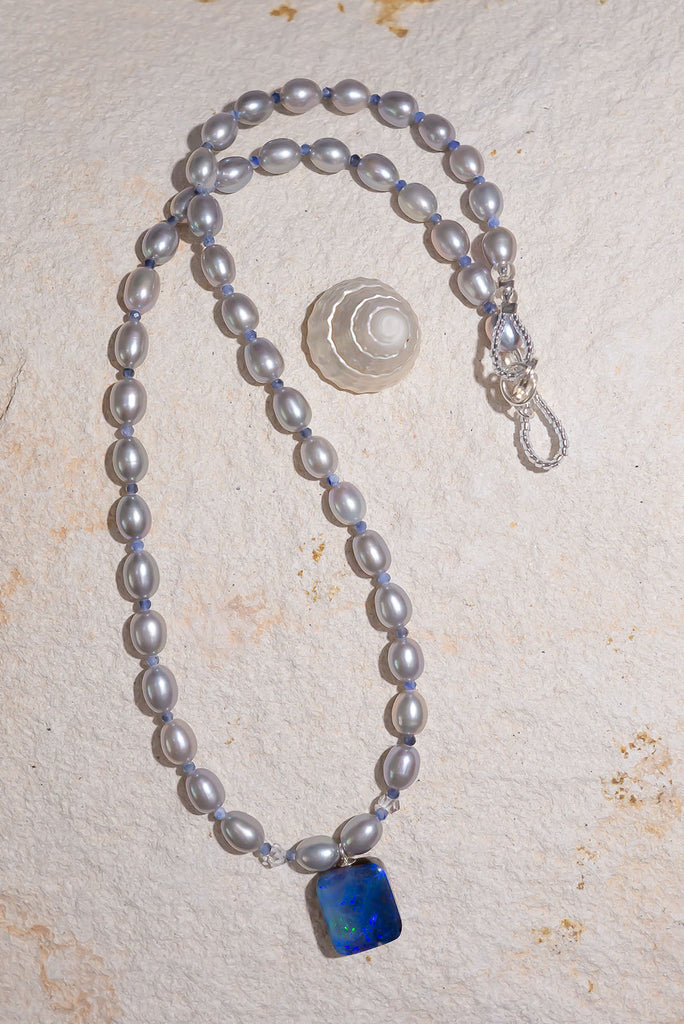 This necklace has a lovely blue Opal which hangs from a strand of shimmery silver grey pearls interspaced by tiny Iolite seed beads, a flash of light in the Herkimer Diamond crystals.