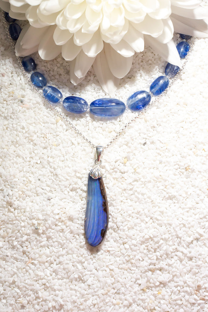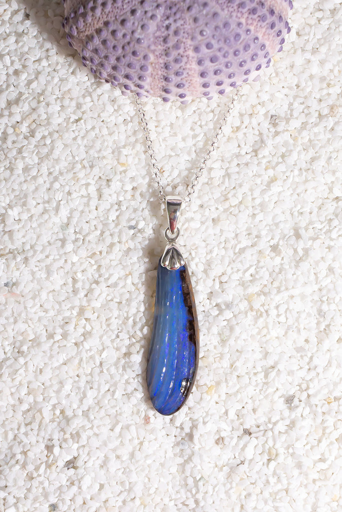 A soft wave of blue mauve washes across this Australian opal pendant, carved into a gentle curve it has a special quiet kind of beauty.