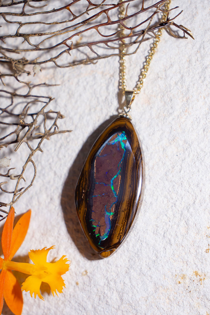 - Australian Boulder Opal pendant in dark rock traced with blue and green crystal.
