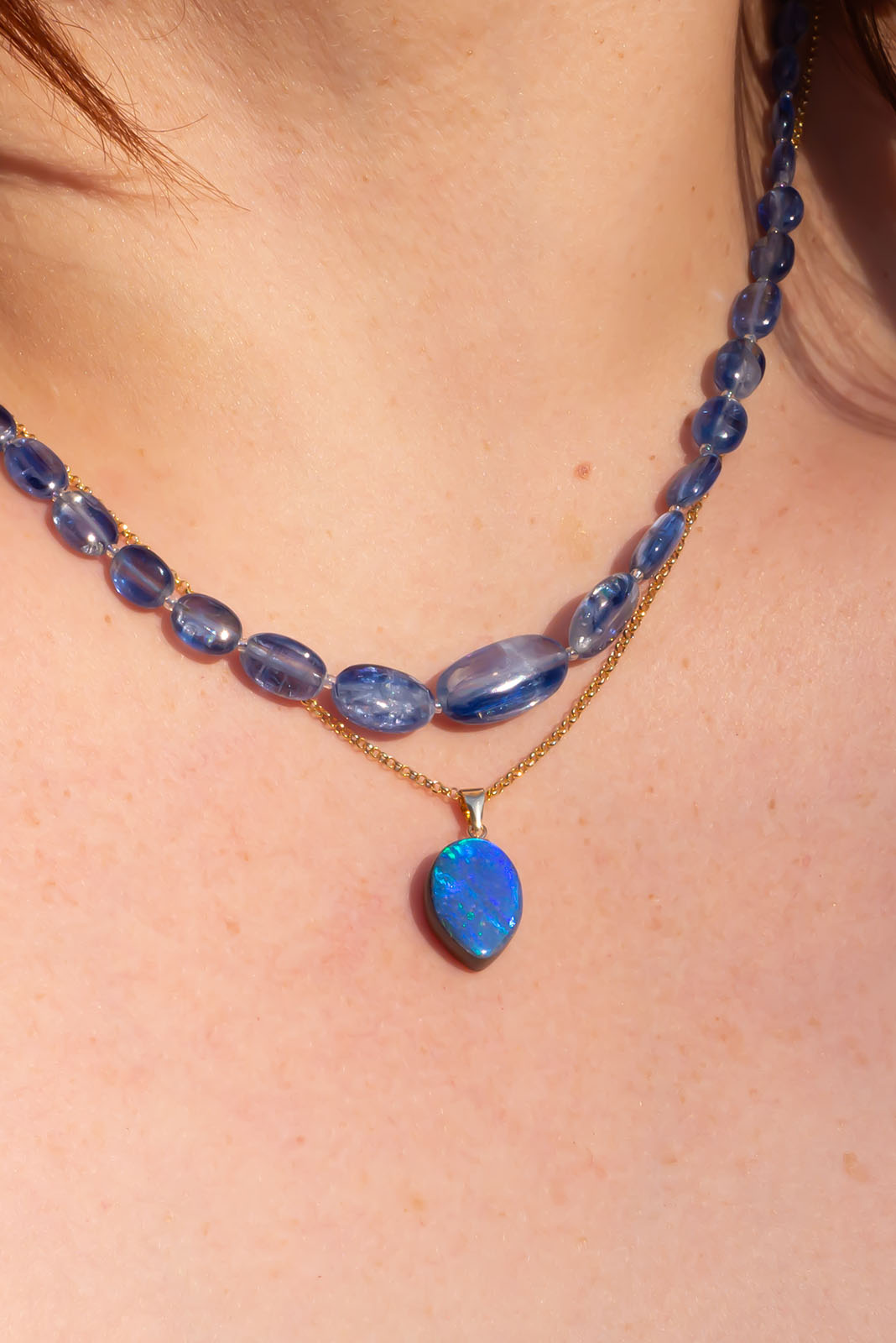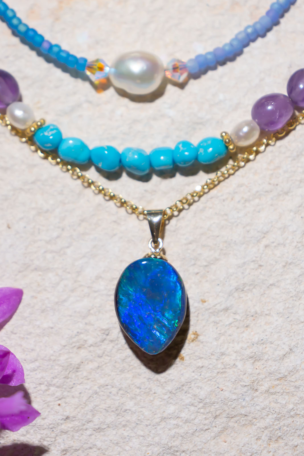 This Australian Boulder Opal pendant has an ocean of green, and blue, flowing across surface. The colours of the sea at the reef.