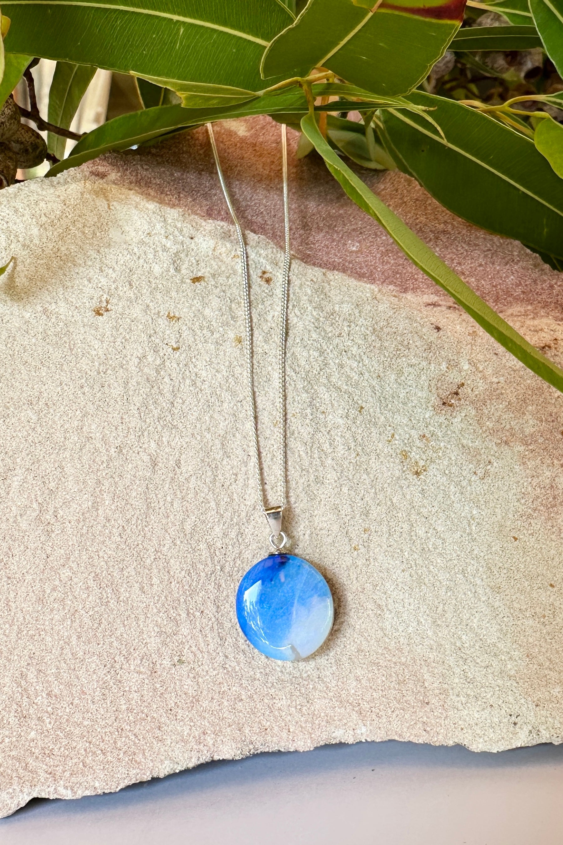 Like a blue crystal moon, this Australian Opal pendant has shades of blue to silvery grey.