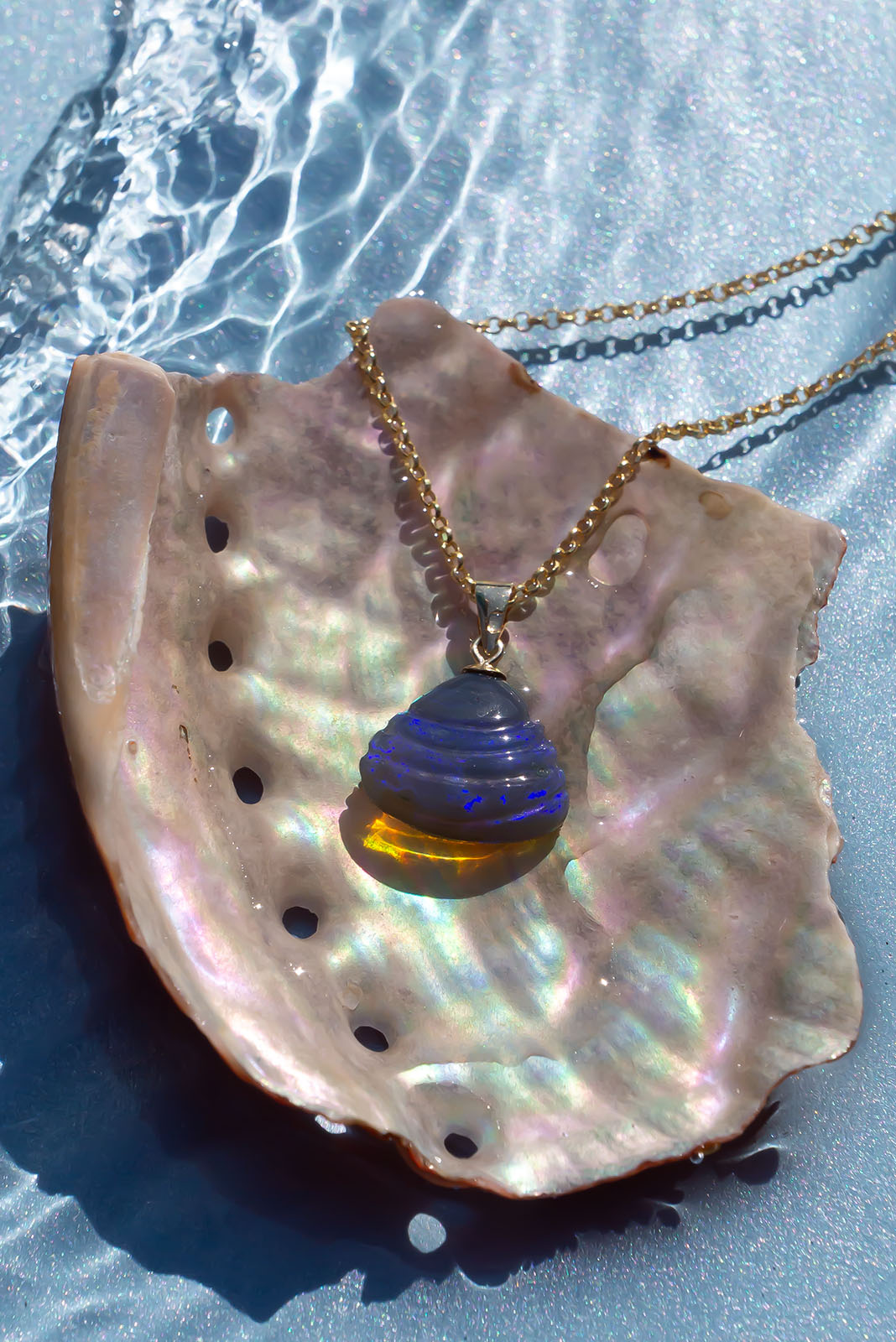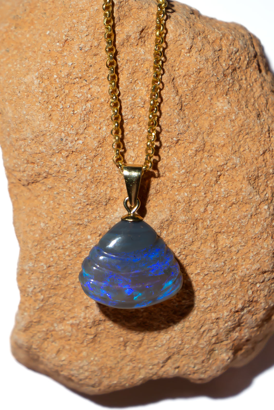 A beautiful Australian solid semi Black Opal pendant carved into the shape of a a sea shell, it has deep crystalline detail, a unique statement opal pendant that could be an ancient seashore find.