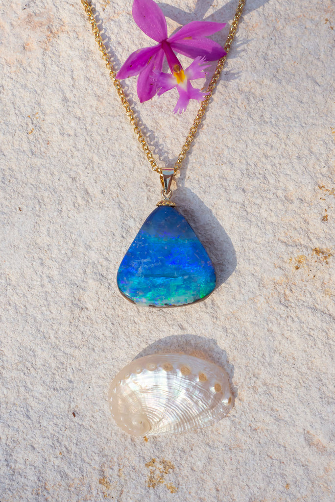 A tide of green, teal and blue, flowing across beach. This opal pendant has the colours of the ocean and the reef, maybe a remote island in the South Pacific.