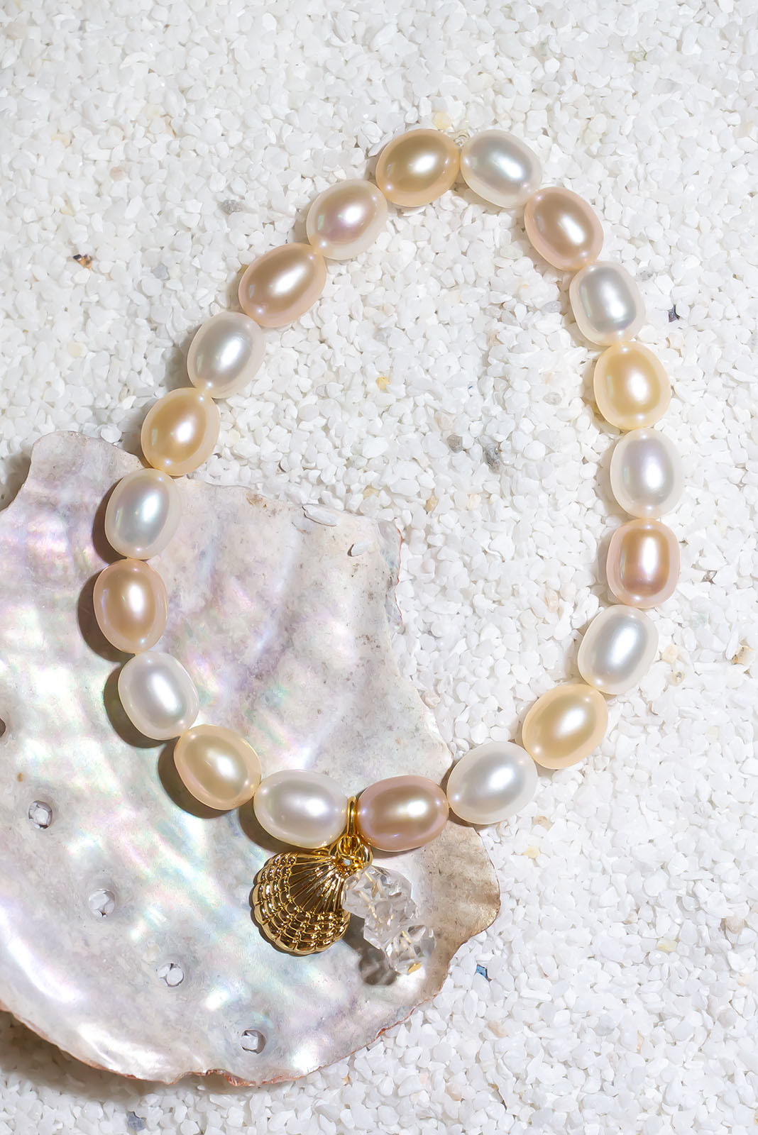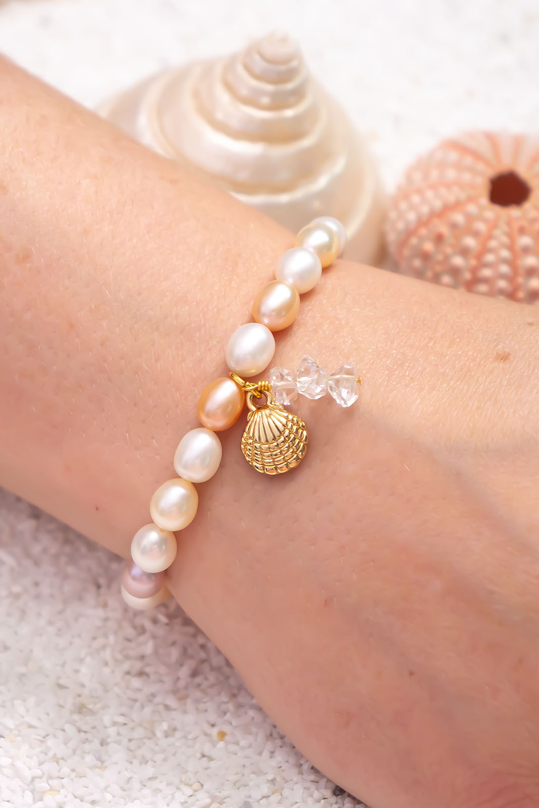 An ocean inspired Pearl bracelet, softly glowing pearls in palest pink and cream with a golden seashell charm highlighted by Herkimer diamonds. A design inspired by the South Pacific islands its perfect for the everyday, also as a stacking bracelet.