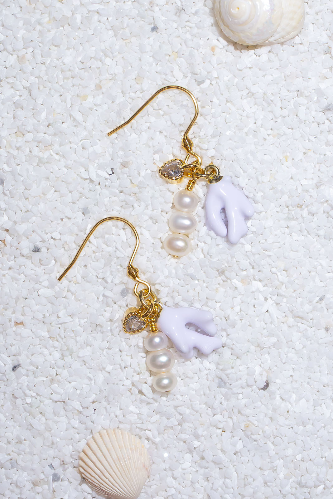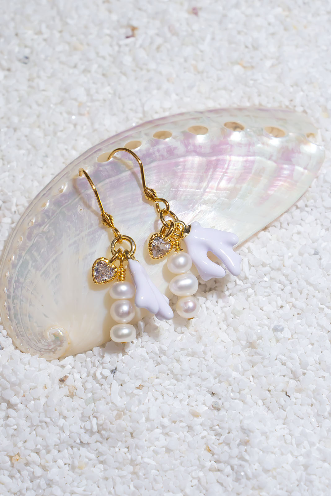 - Gold plated heart charm, freshwater pearls and white enamelled coral charm.
