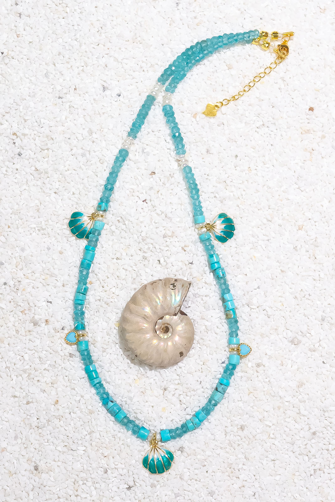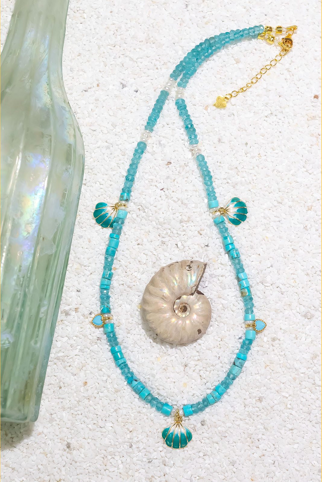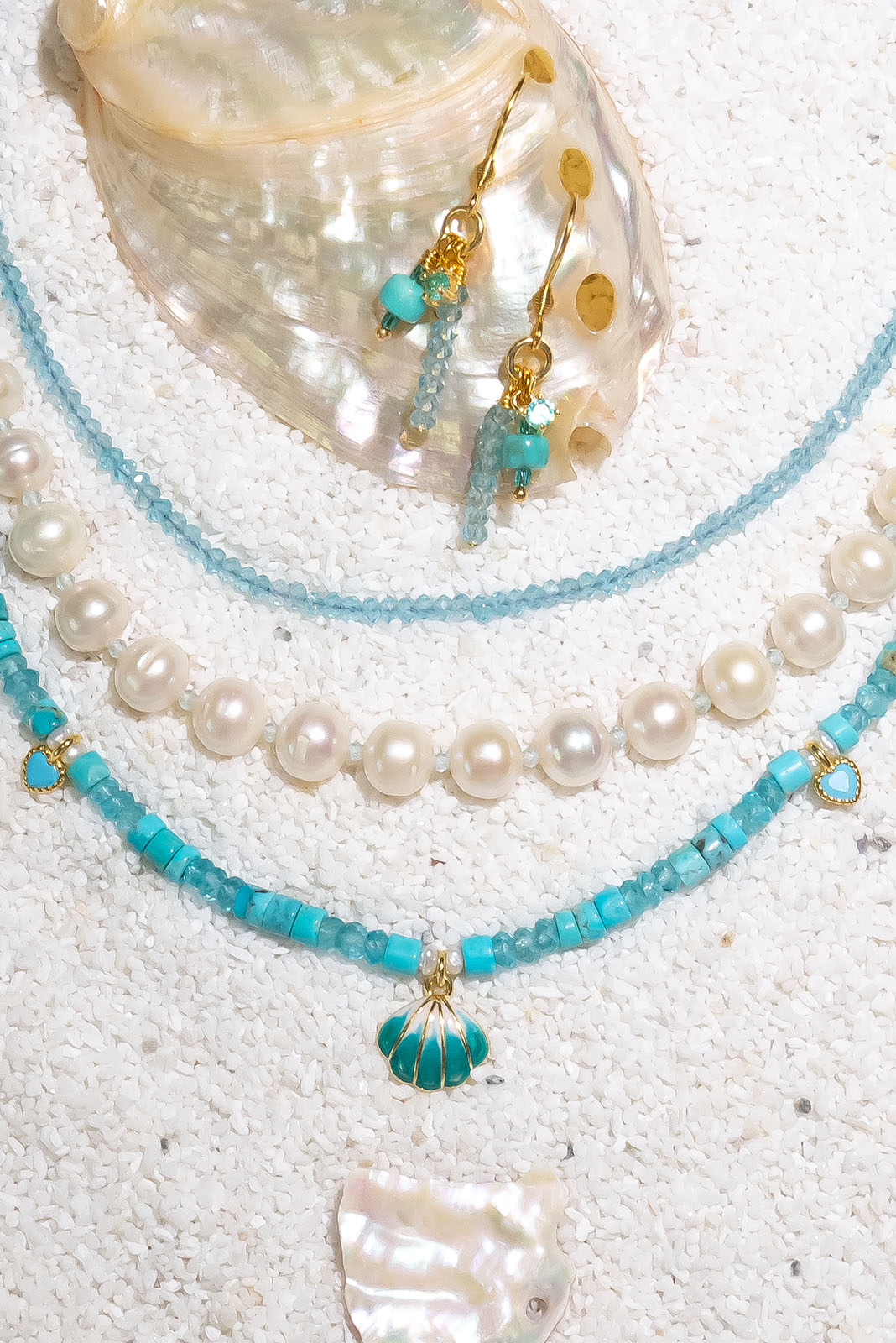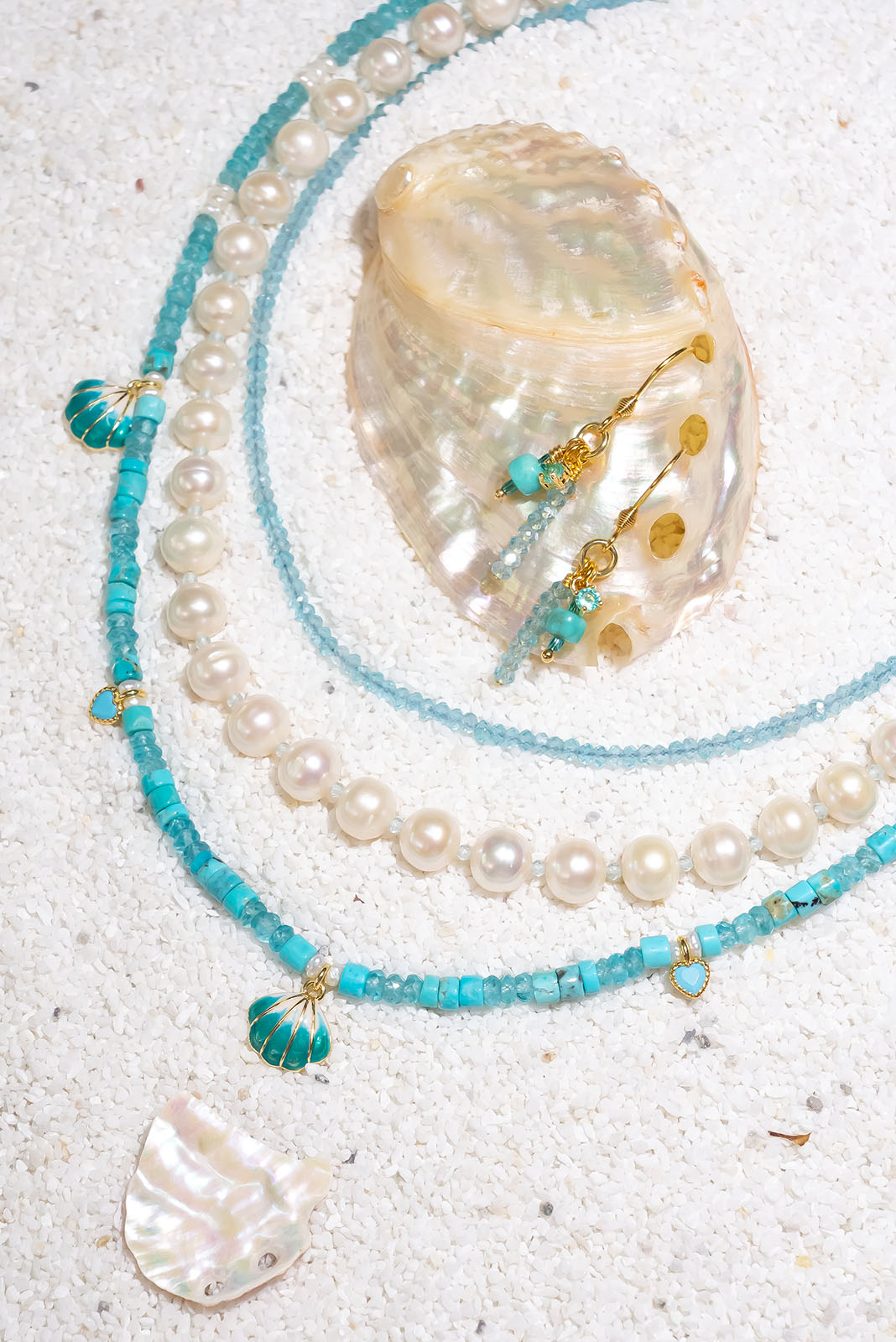 - Kingman Turquoise, Freshwater Pearls, Apatite & Gold Plated Charms.
