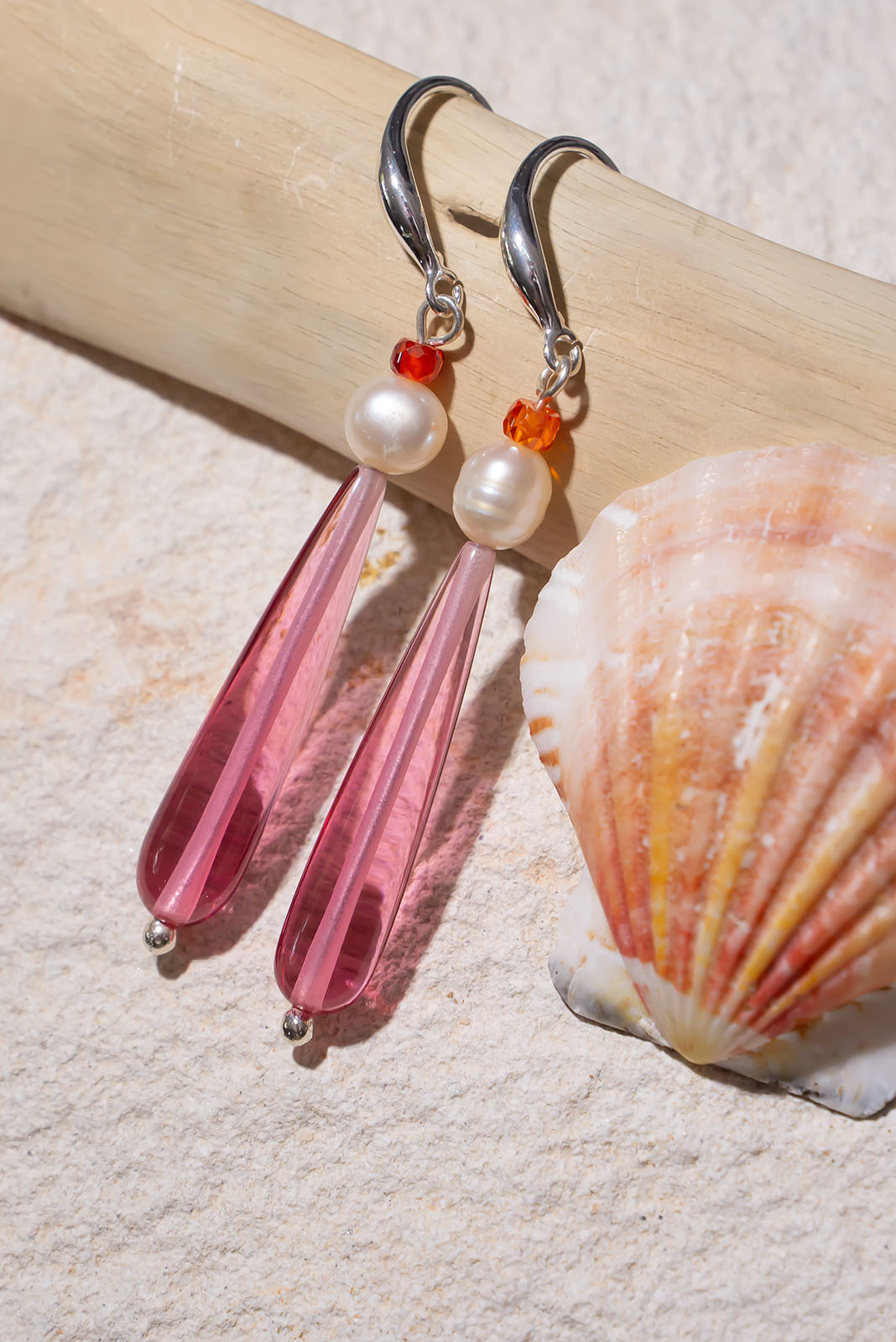 Drop earrings as pretty as a rosebud, a perfect soft pink crystal with a pearl. Soft as a summer morning.
