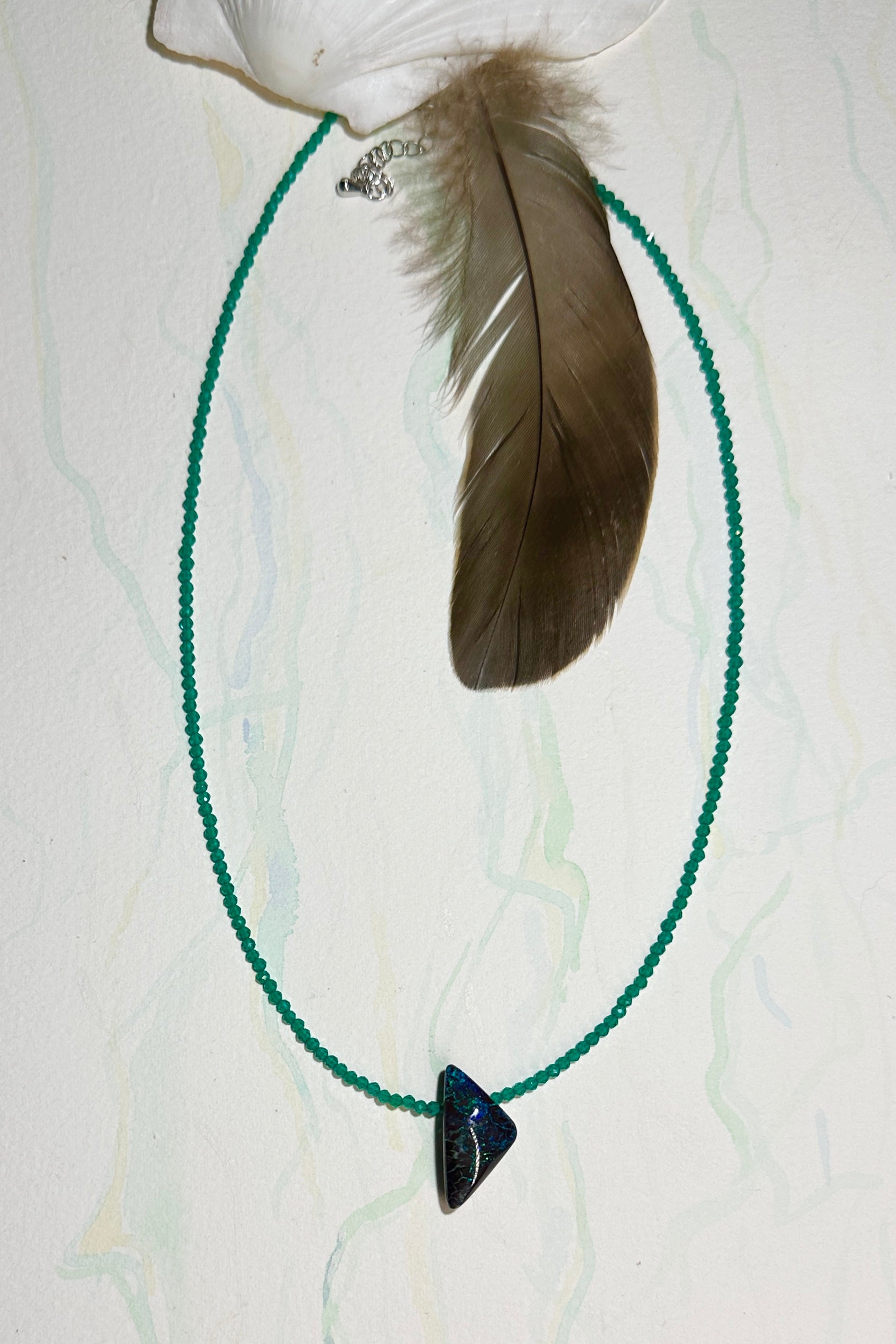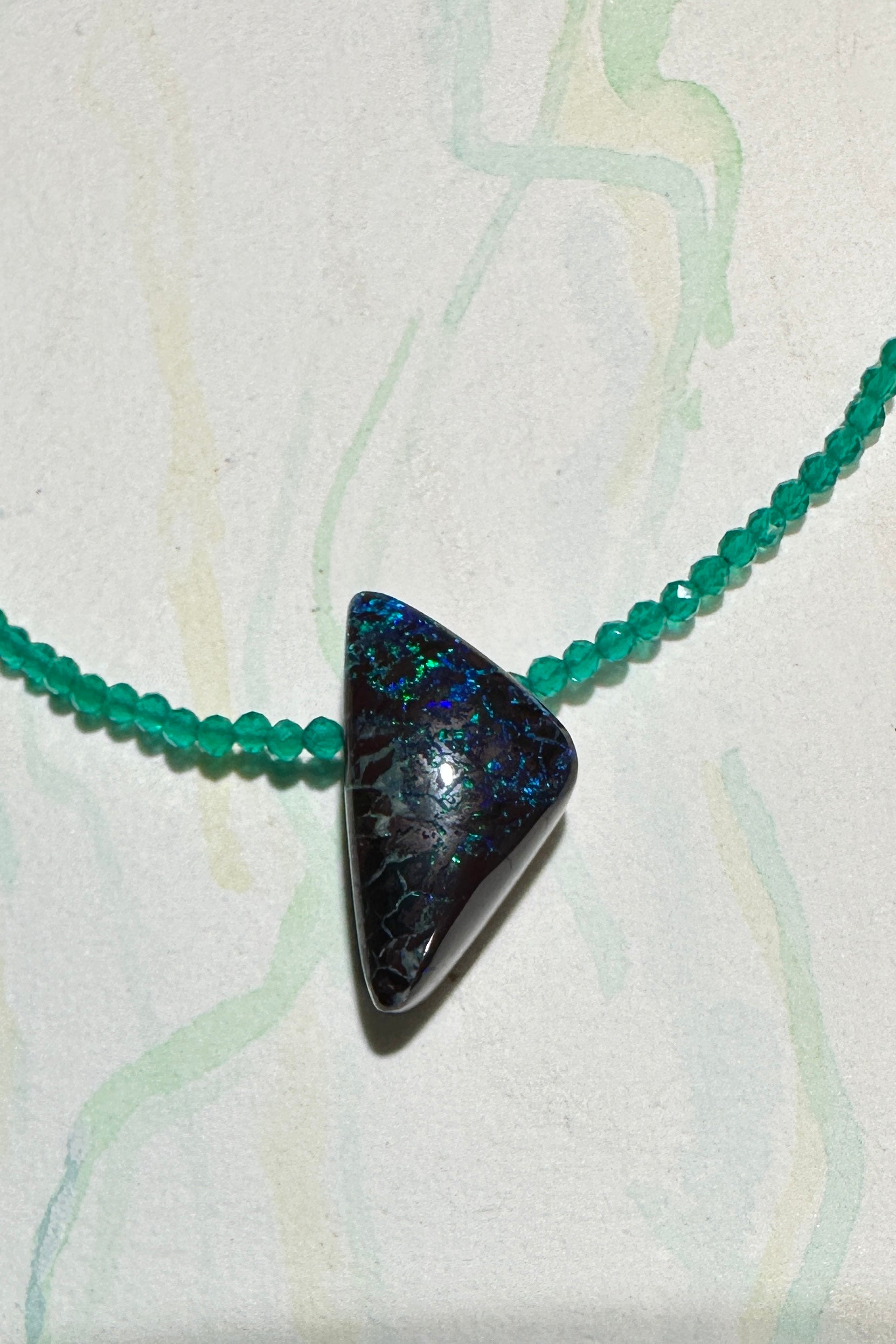This necklace of sparkly green Agate beads has a triangular cut Australian Opal centrepiece, the tiny rivulets of green, blue crackle across the stone enhanced by the faceted green beads.