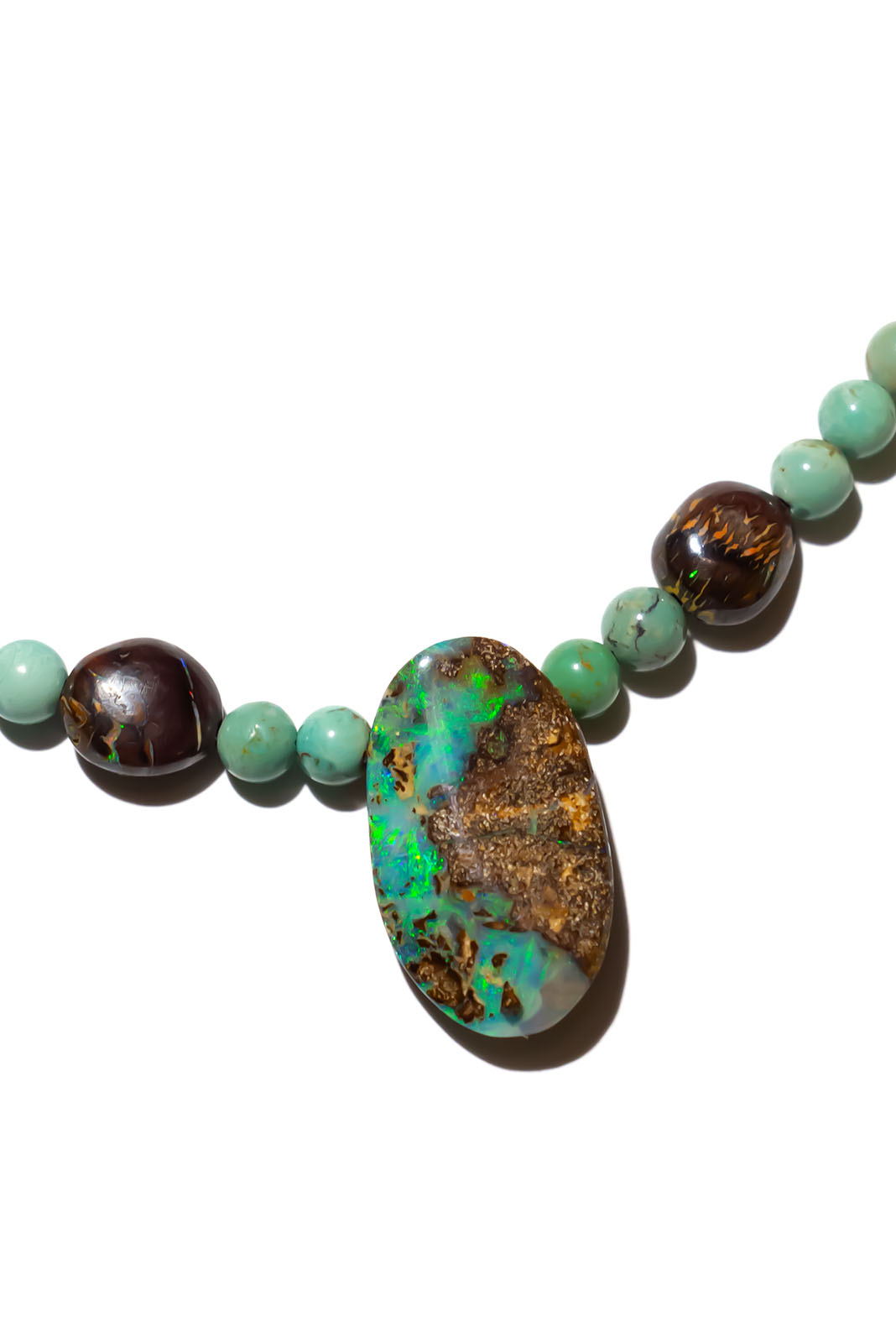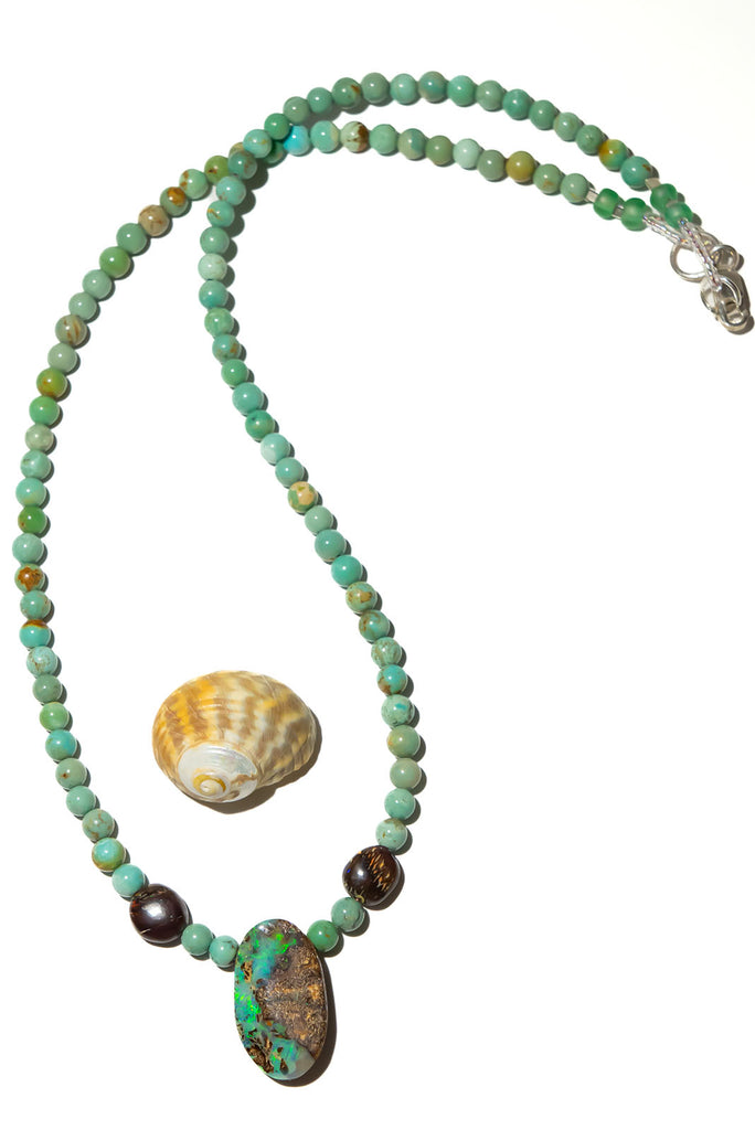 - Necklace is beads of natural Turquoise in soft sky blue colour with ochre flecks, there is also an Opal bead on each side.