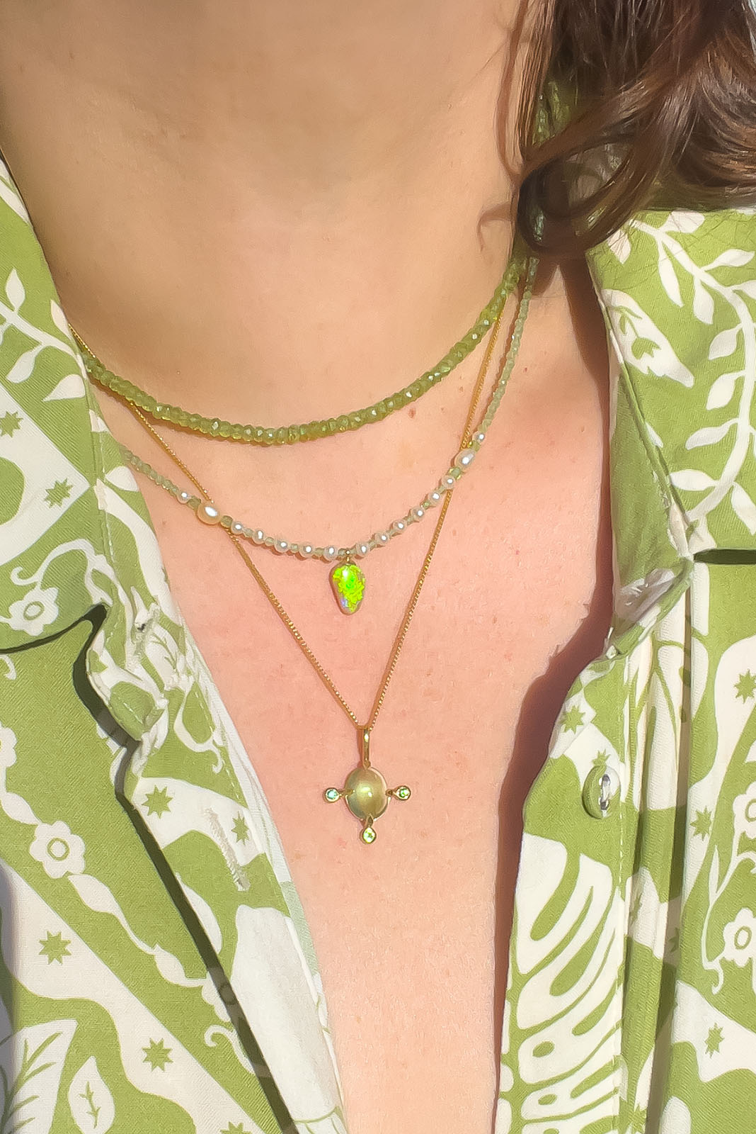 Pale green faceted Peridot beads perfectly compliment the flashy green crystal Opal pendant, a sprinkle of tiny white seed pearls complete the look.