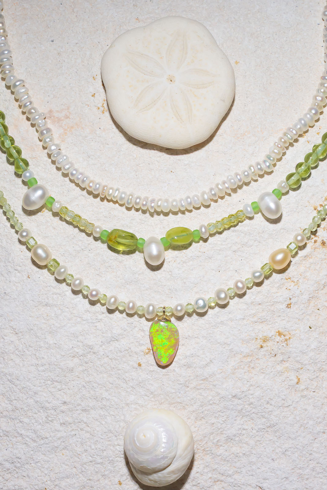 Australian white crystal Opal, Peridot beads, tiny cream pearl beads.
