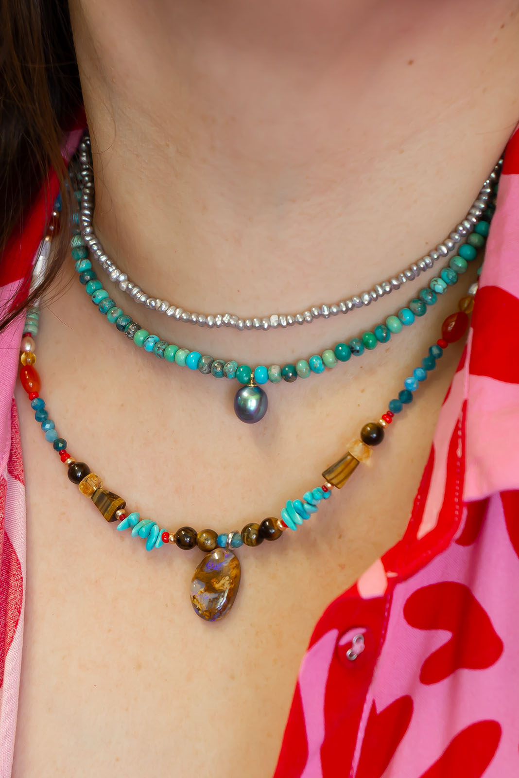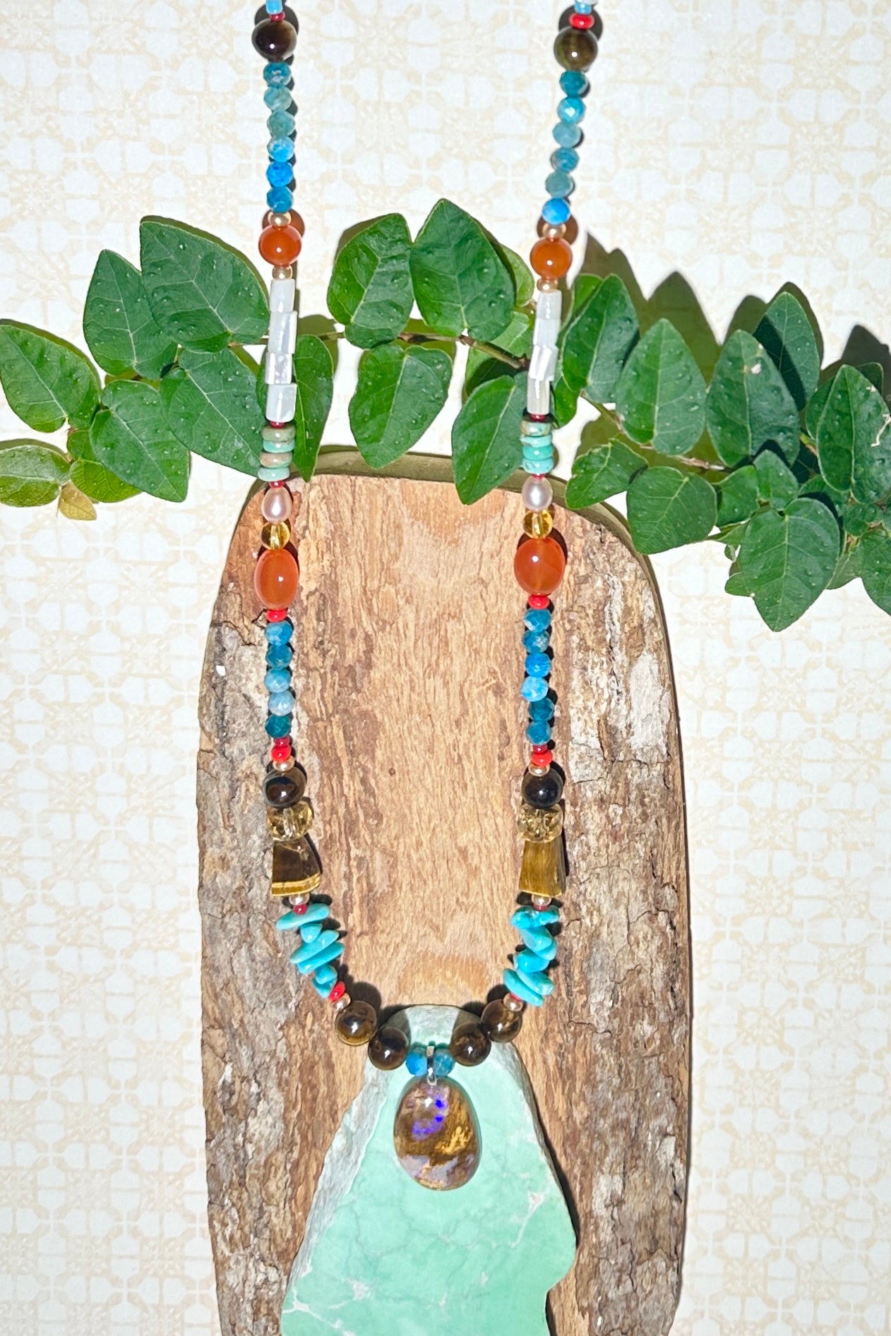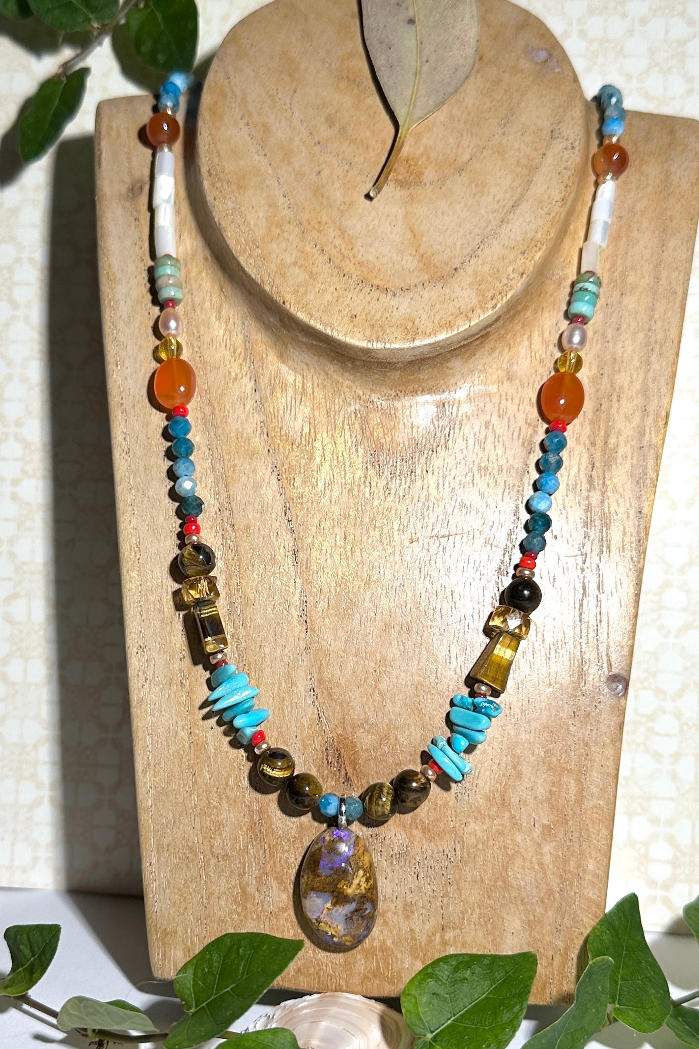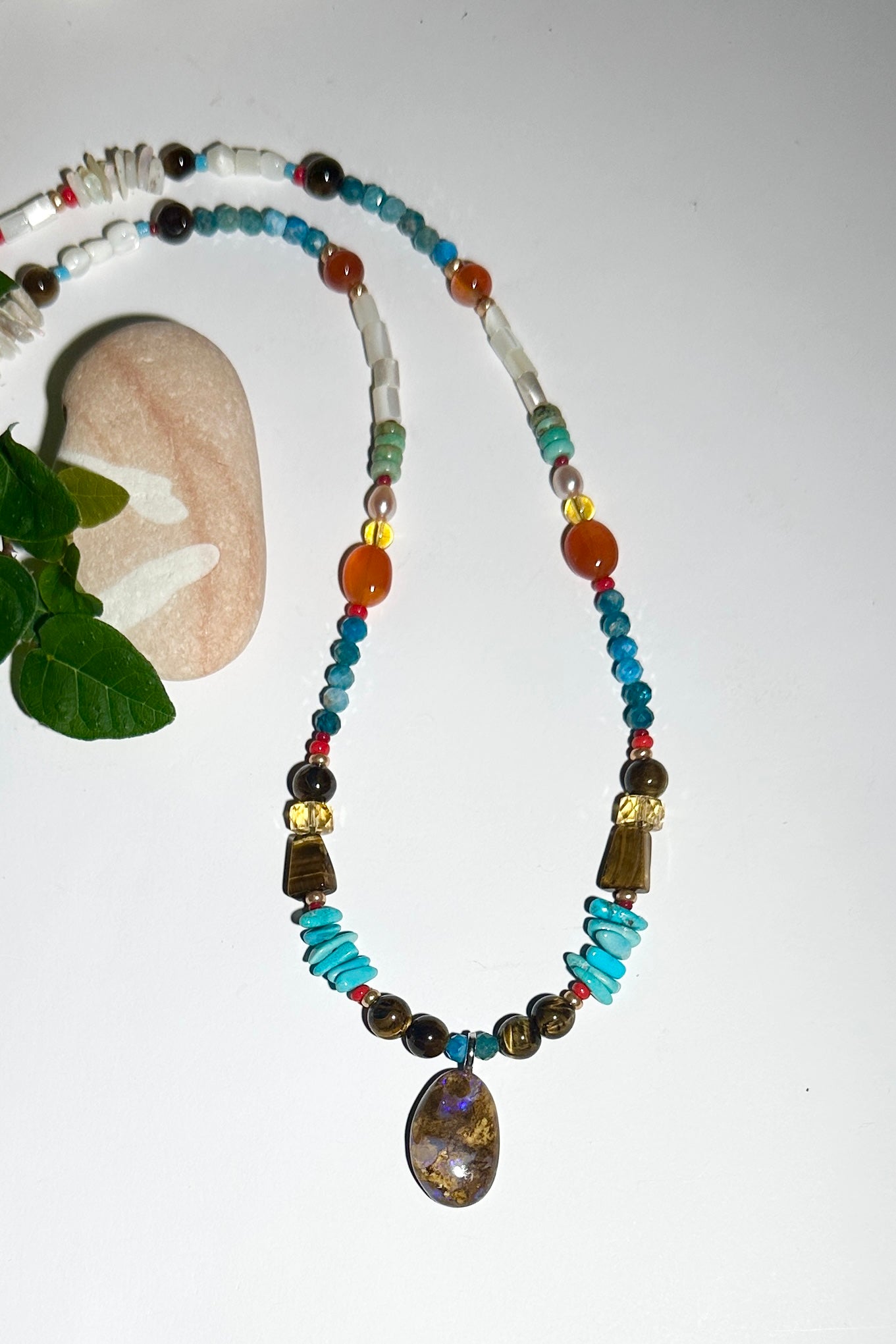 - Solid Boulder Opal pendant strung on Turquoise, Tigers Eye, Citrine, Carnelian, Amazonite, Pearl and shell beads. Opal is ethically sourced.