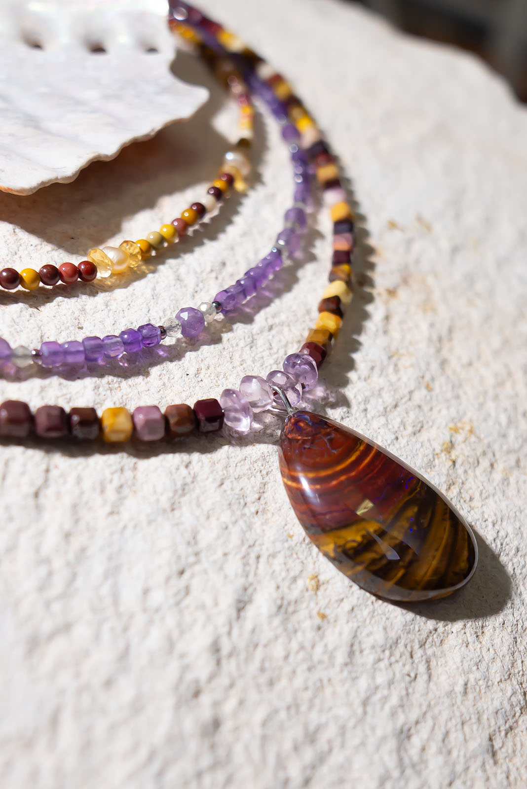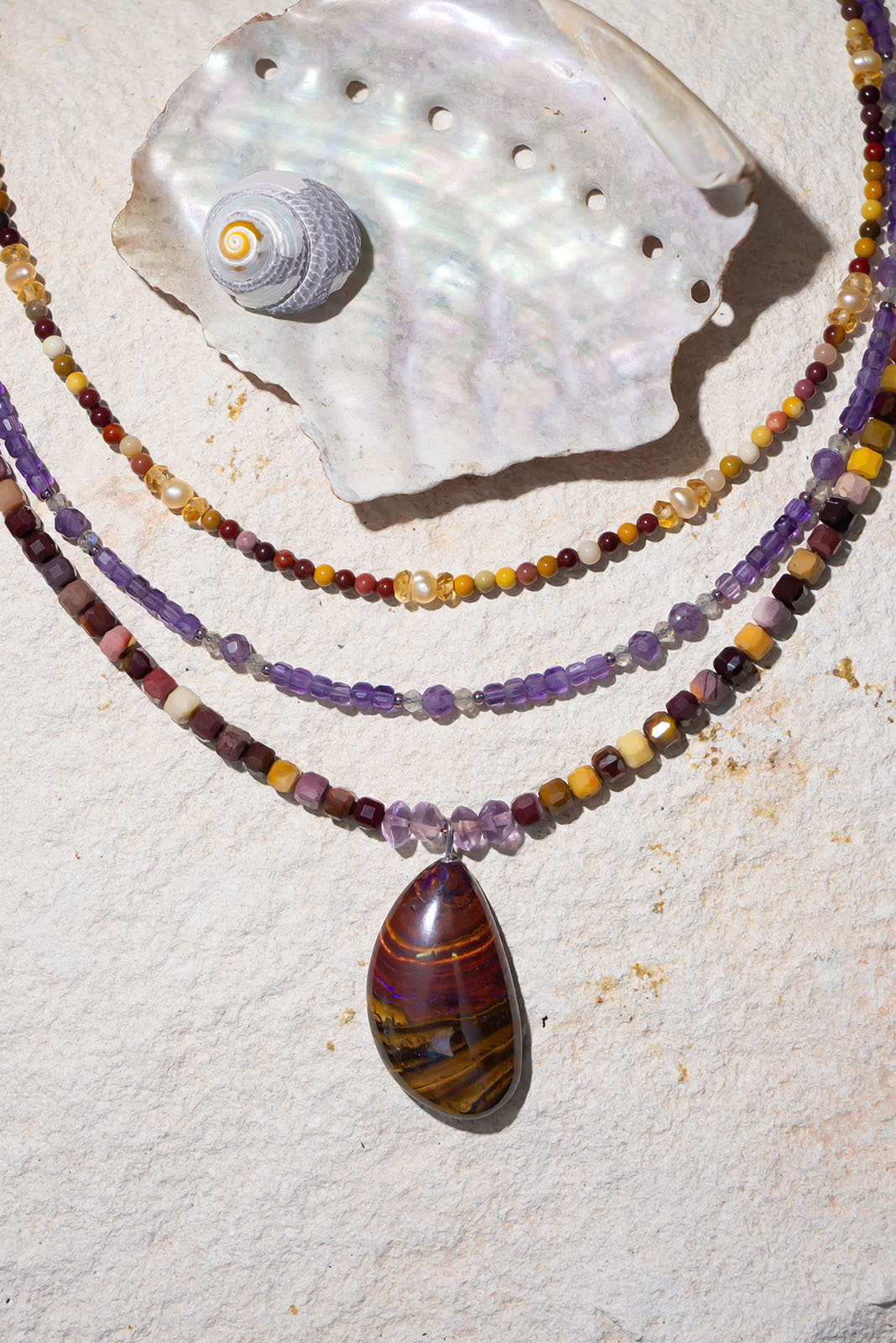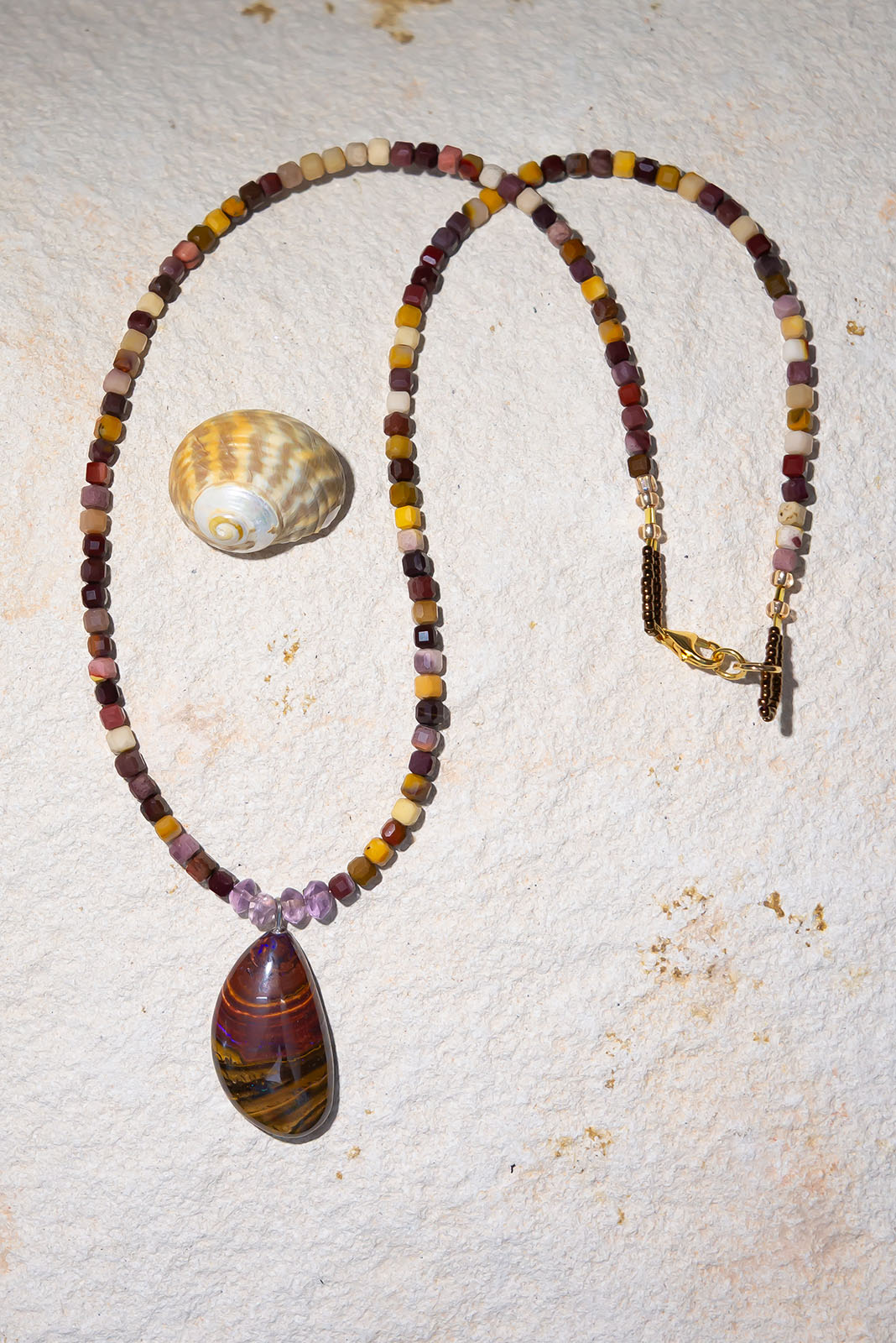 - Solid Boulder Opal pendant strung on cube faceted Mookaite and Amethyst.