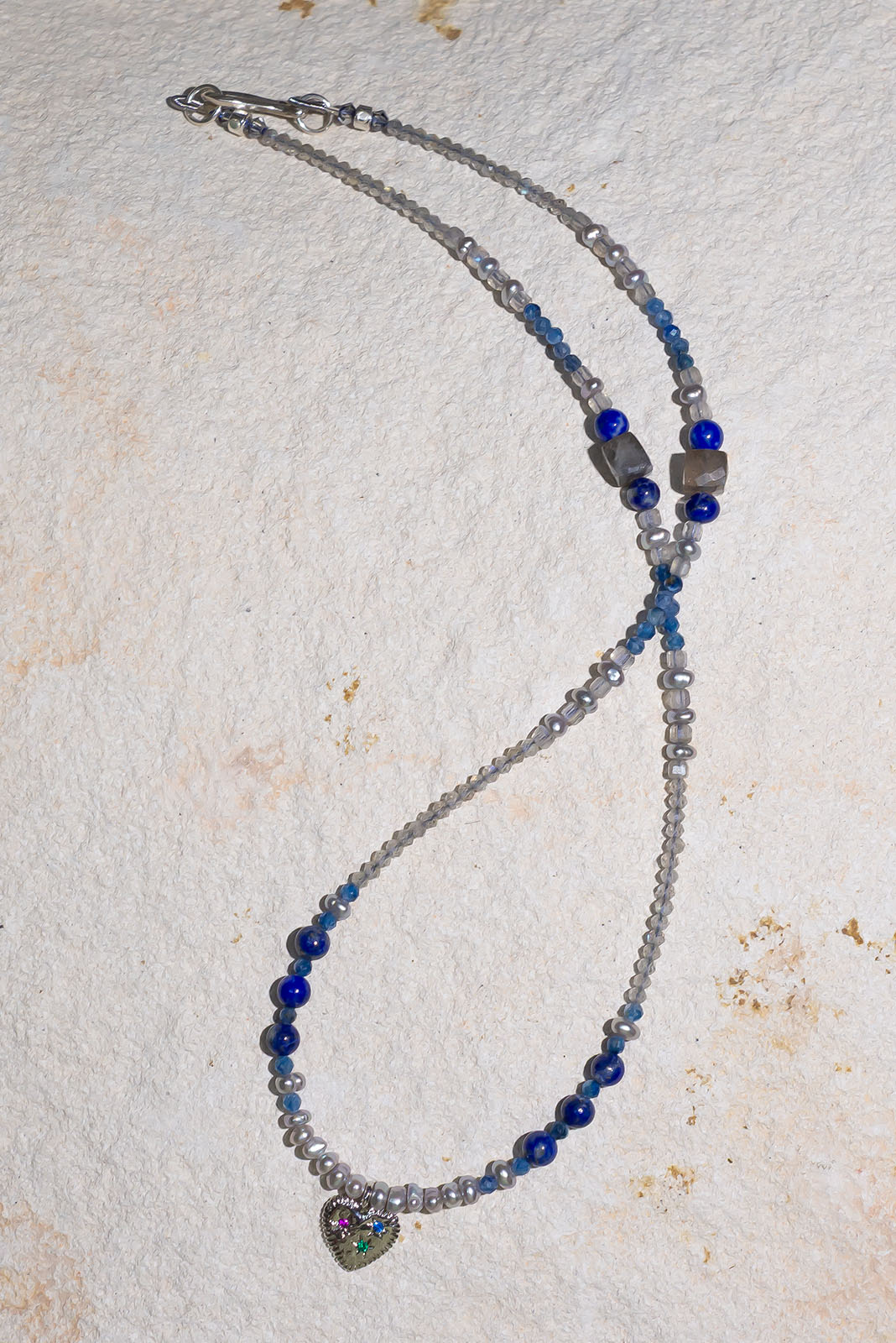 - Lapis Lazuli, labradorite, fresh water pearl, kyanite & a silver plated heart charm.