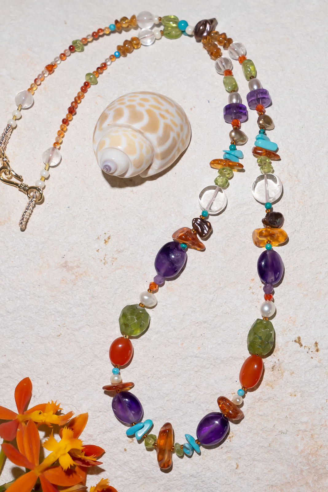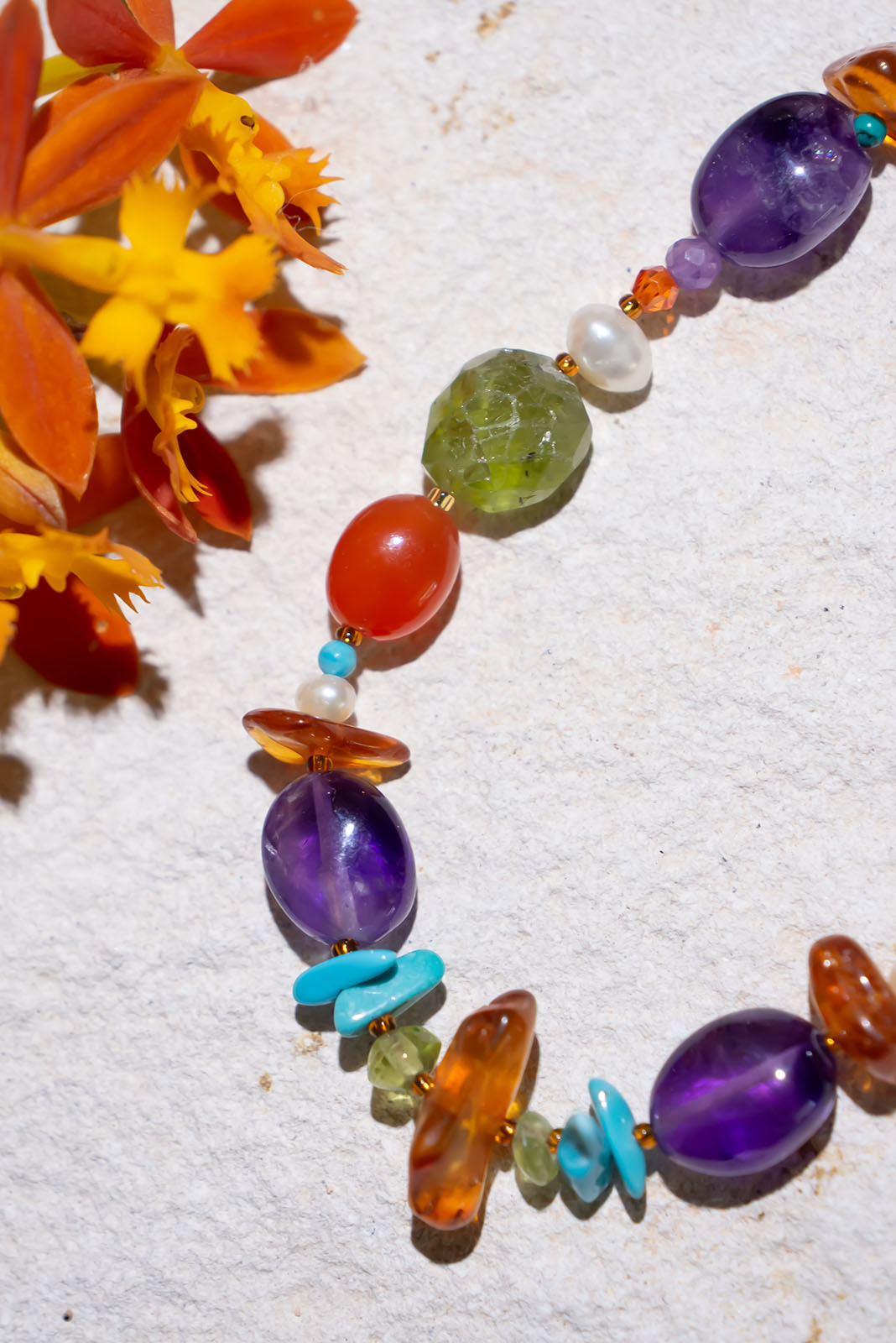 - Carnelian, Amber, Rock Crystal, Turquoise, freshwater pearls, Amethyst, Peridot, and Citrine.