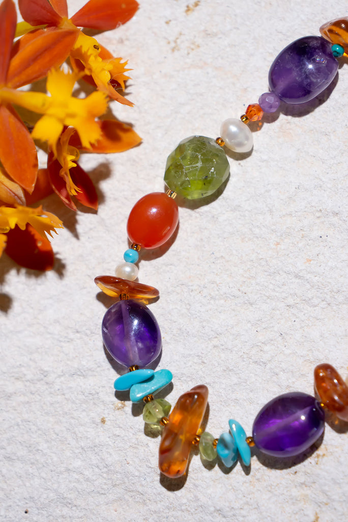 Our new and most amazing Inez gemstone necklace brings a joyous tumble of colourful gemmy stones, A world of colour and possibilities.