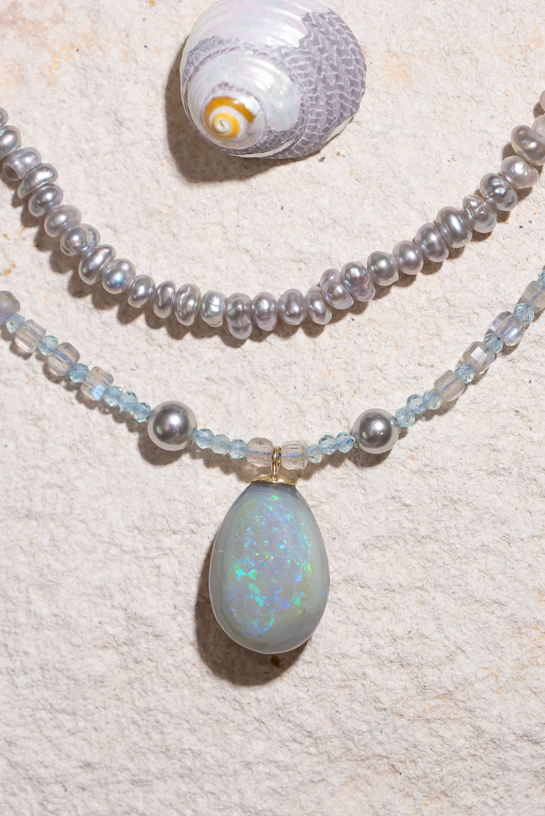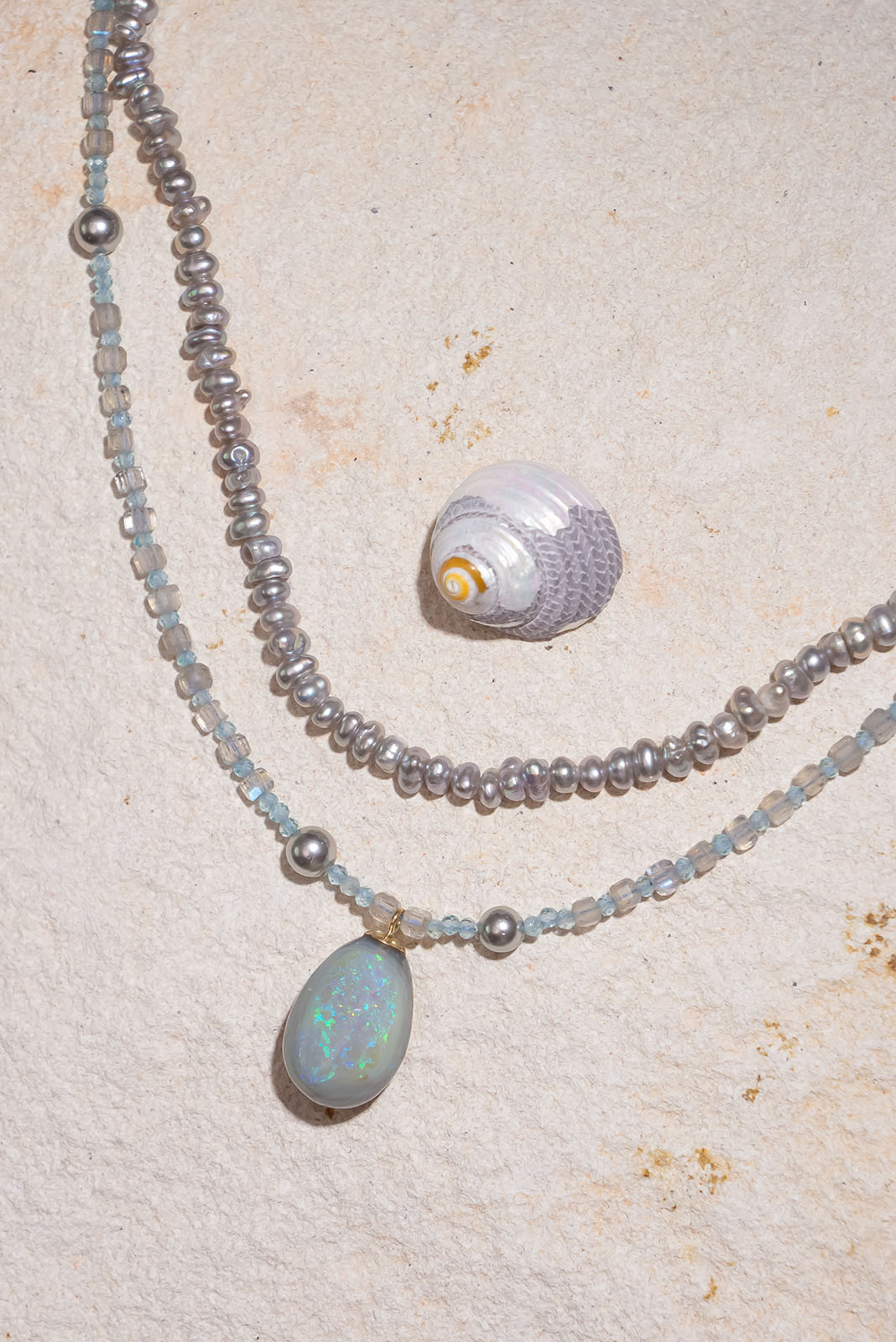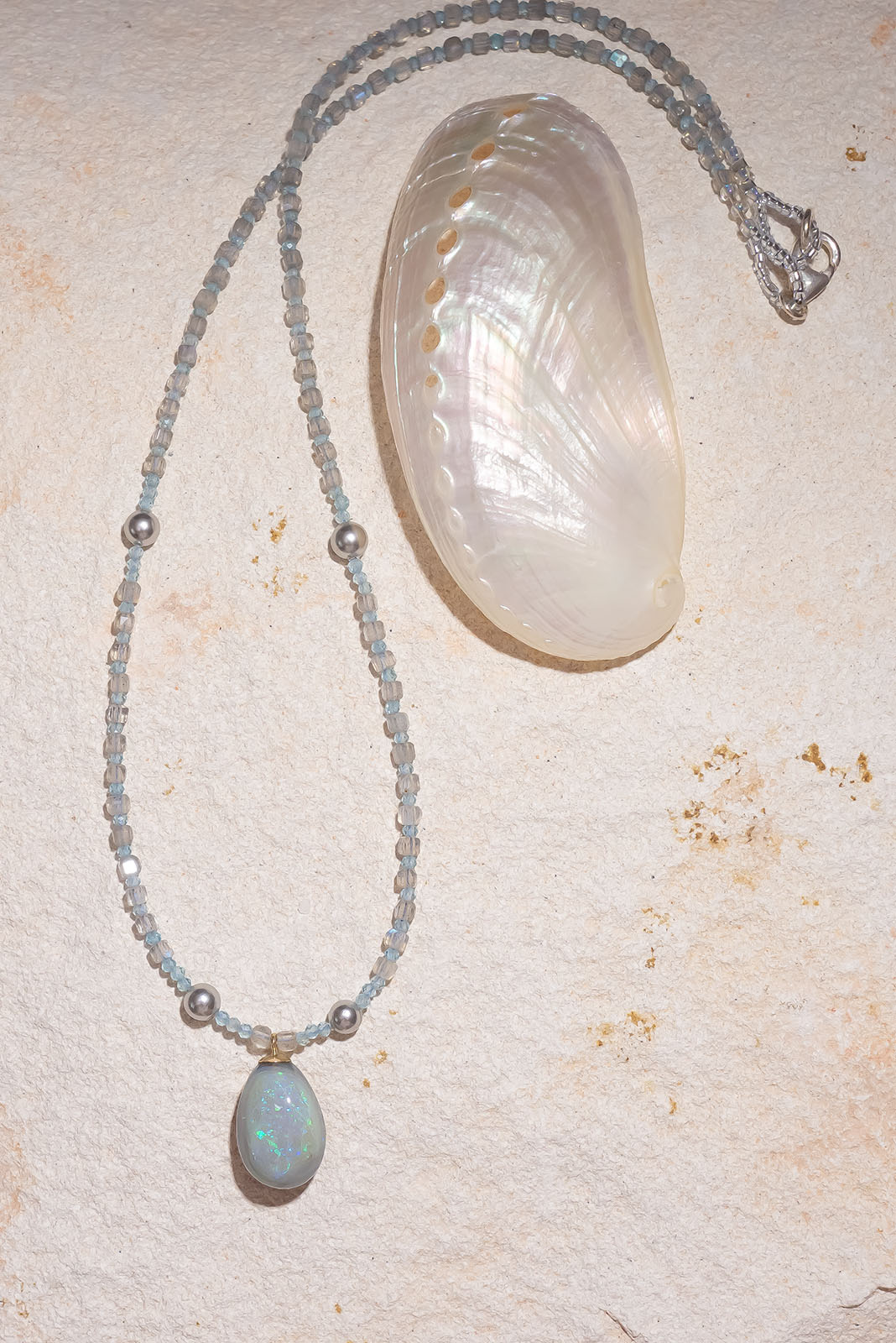 This opal pendant on silvery Labradorite beads shimmers like snowfall in the early morning lights.