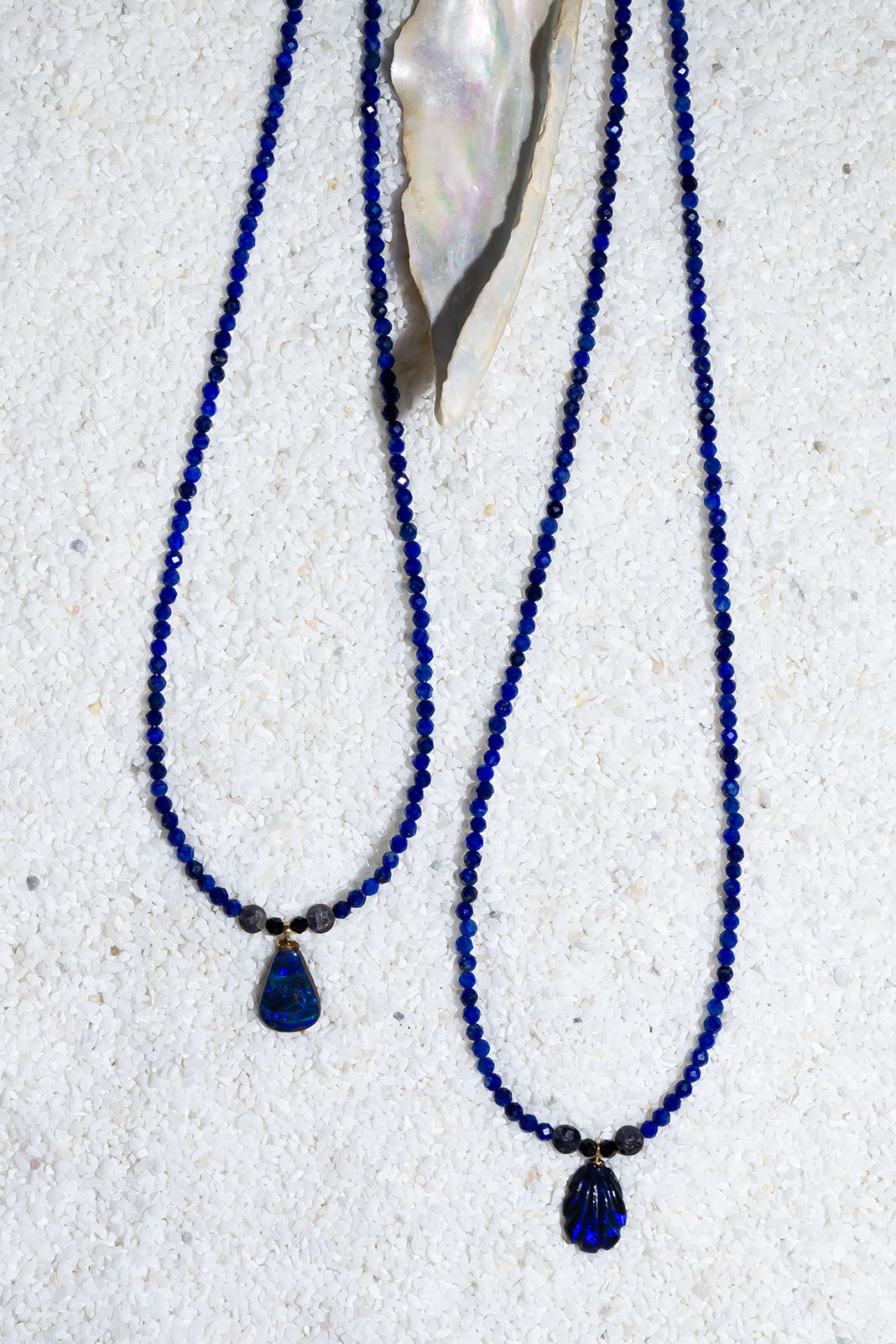 This delicate Australian Opal necklace is both understated and eye catching, strung on beautiful bright blue Lapis Lazuli beads with tiny Sapphire side beads this Opal droplet is the colours of the deep blue sea.